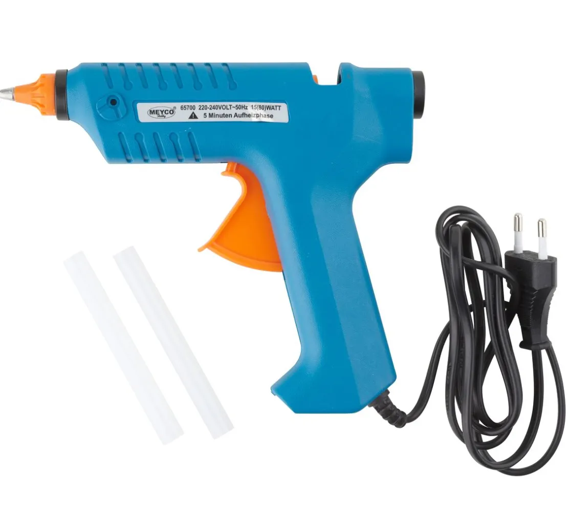 Eine Heißklebepistole sollte in keinem Haushalt und in keiner Hobbywerkstatt fehlen. Die Klebepistole verfügt über einen hilfreichen Ablageständer und kann mit 11 mm Klebesticks bis zu einer Länge von 20 cm betrieben werden. Sie können mit dieser Klebepistole viele Materialien kleben. Nach einer Vorheizzeit von 5 Minuten ist die Klebepistole einsatzbereit. Tragen Sie den Kleber punktförmig auf die Klebefläche auf und führen Sie die Werkstücke innerhalb von 15-20 Sekunden zusammen. Üben Sie dann über ca. 30 Sekunden einen gleichmäßigen Druck aus.