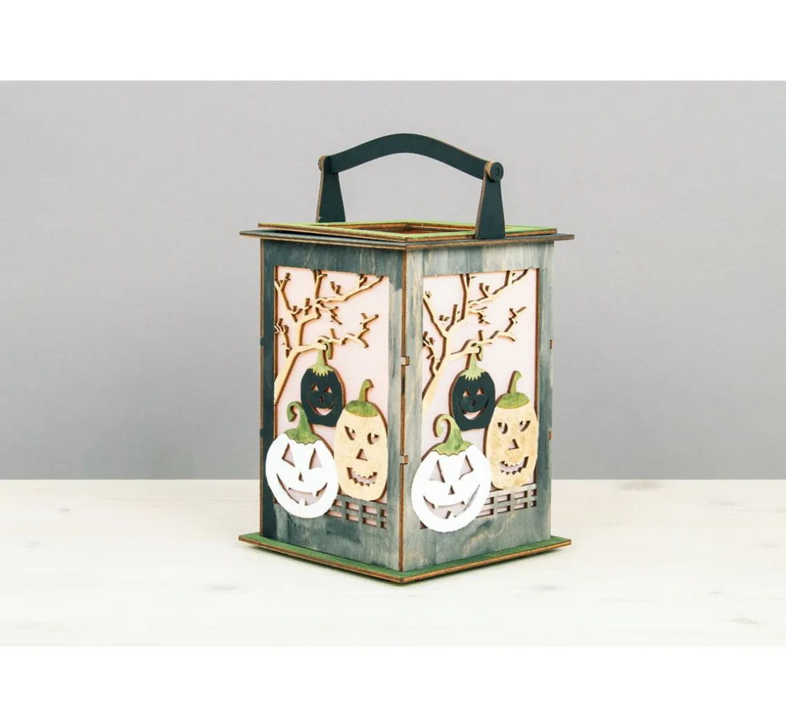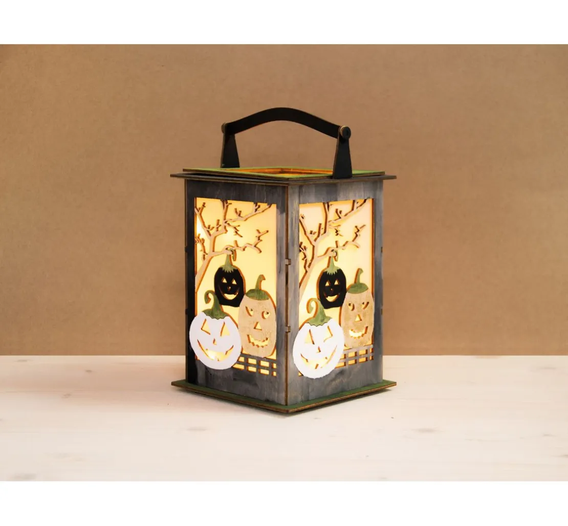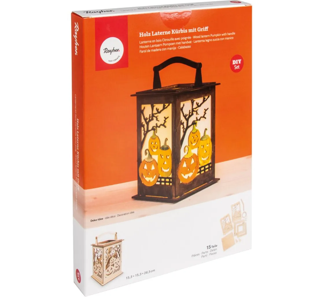 Die Holz-Laterne mit praktischem Tragegriff ist ein tolles Highlight für Halloween oder auch als Nachttischlampe für das Kinderzimmer. Gestalten Sie die einzelnen Elemente der Laterne mit Bastelfarben, Holz-Lasur, Glitter und vielem mehr. Ganz nach Ihren eigenen Vorstellungen. Wenn gewünscht, kann noch Laternenfolie oder Effektfolie zugeschnitten und eingeklebt werden. Für die Beleuchtung verwenden Sie eine LED-Lichterkette oder ein LED-Teelicht. So kommen die schaurigen Kürbisse gut zur Geltung.