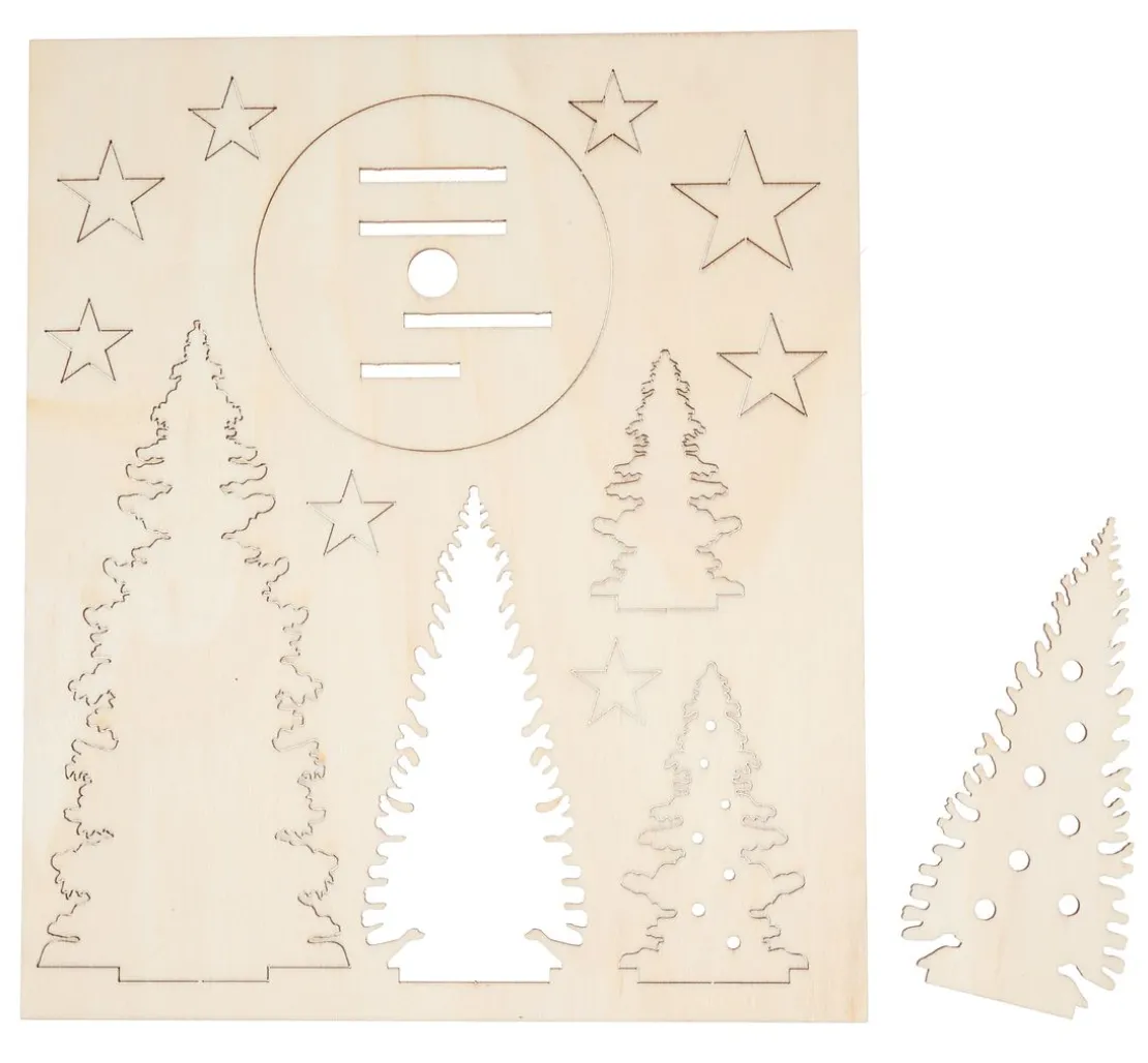 Diese niedliche 13-tlg. Holz-Steckmotiv besteht aus vier Tannen ca. Länge 4,3 cm x Höhe 6,5 cm bis ca. Länge 4,5 cm x Höhe 10 cm die auf einem Standfuß zusammengesteckt werden. Die acht Sterne mit einem Ø von ca. 1,8 cm bis 3 cm gehören ebenfalls zum Set und können nach Belieben gestaltet und integriert werden. Die Stärke der Holz-Motive ist ca. 2 mm.