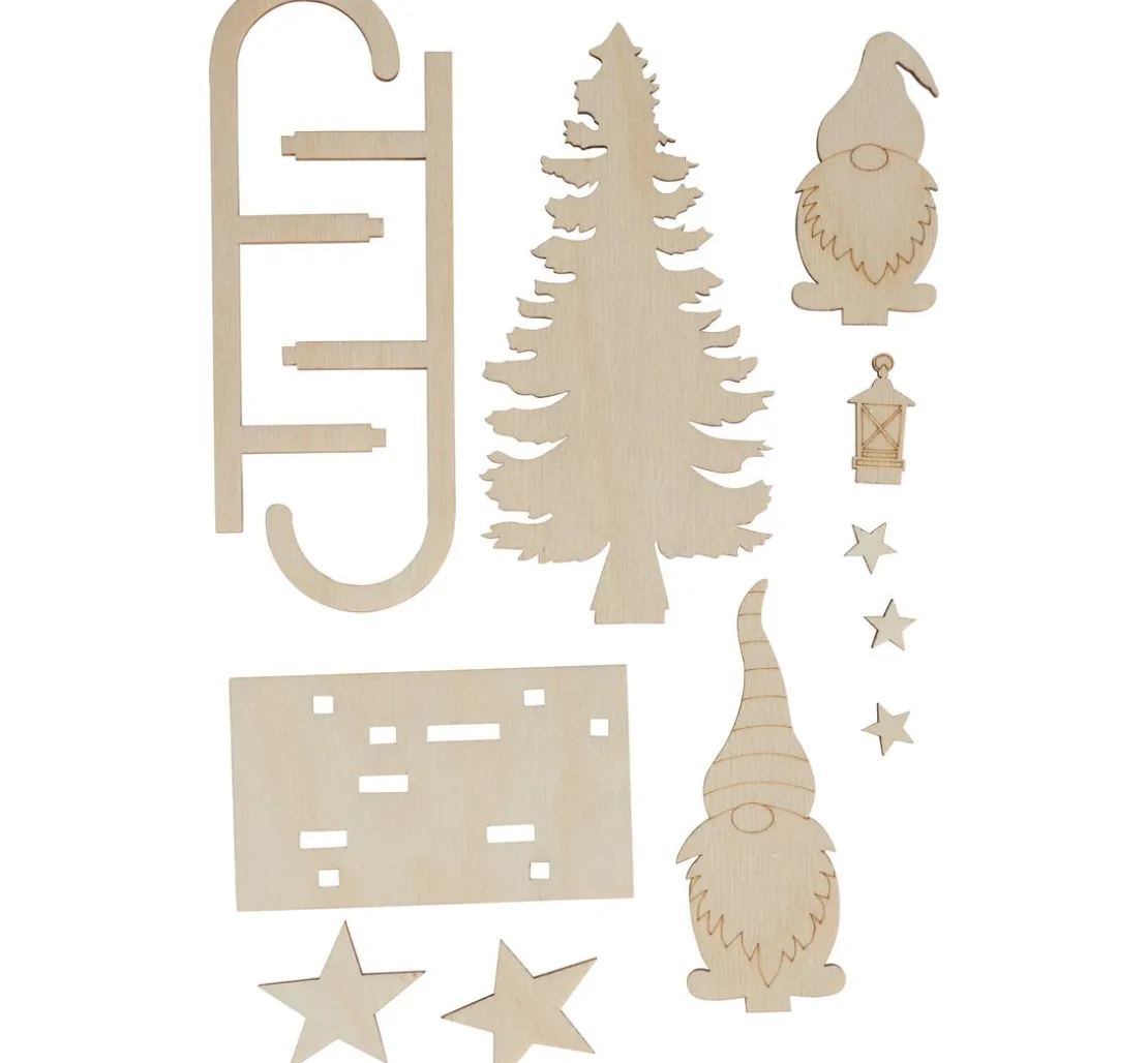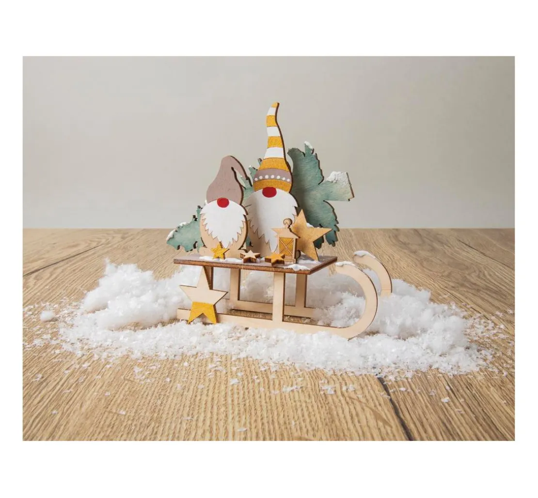 Ein wundervolles Holz-Steckmotiv „Wichtel-Schlitten“ bestehend aus 12 Teilen. Zusammengebaut hat der Wichtel-Schlitten eine Größe von ca. 11,5 x 5 x 16,5 cm. Die einzelnen Teile werden einfach zusammengesteckt und mit etwas Bastelkleber (nicht enthalten) fixiert. Das Material ist hochwertiges Sperrholz. Ein Bild auf einer kurzen Anleitung dient als Hilfe für den Aufbau.