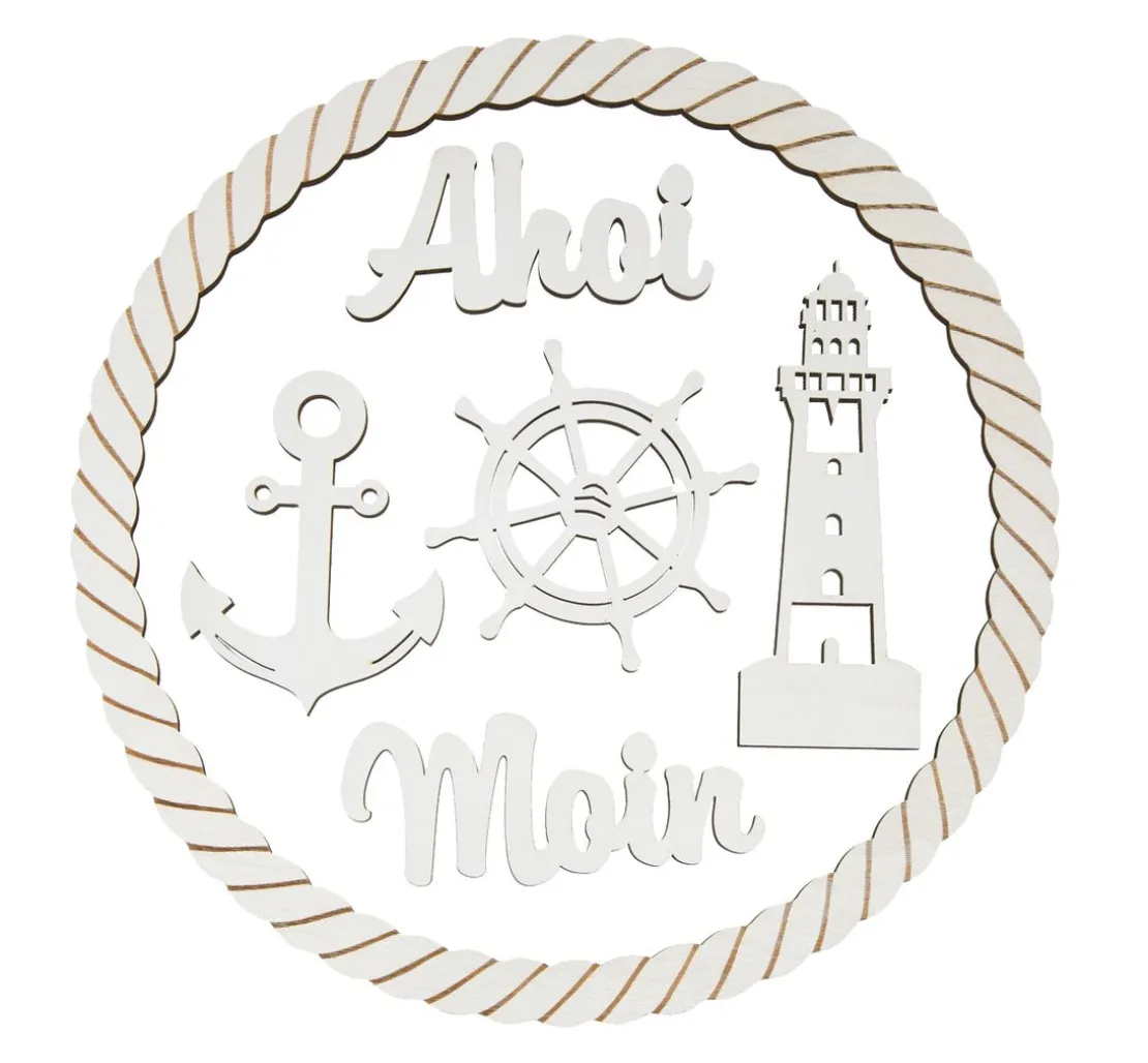 Das weiße Holzring-Set „Maritim“ besteht aus einem Ring mit einem Ø von ca. 26,5 cm und 5 Holzmotiven. Die 2 Schriftzüge haben eine Größe von ca. 10 – 11,5 cm, der Leuchtturm ist ca. 5 x 13 cm groß, das Steuerrad hat einen Ø von ca. 9 cm und der Anker hat eine Größe von ca. 7 x 9 cm. Alle Teile haben eine Stärke von ca. 5 mm, sind aus Mischholz gefertigt und lasergeschnitten, daher kann es produktionsbedingt zu leichten Brandspuren an den Kanten kommen.