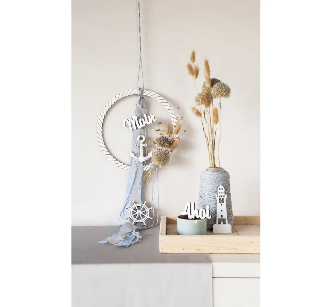 Die maritime Dekoration sorgt für einen Hingucker im Fenster, an der Tür oder Wand. Mit Heißkleber lassen sich die Holzmotive am Ring befestigen und unifarbene Schleifenbänder, Motivbänder, Muscheln, Anhänger, Trockenblumen und weitere Streuteile sind eine prima Ergänzung. So entsteht schnell eine wohnliche, maritime Dekoration.