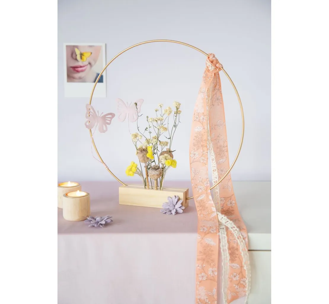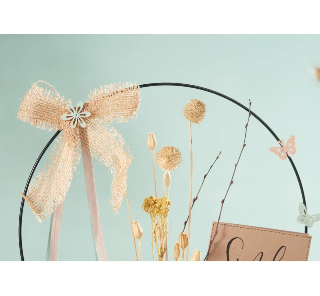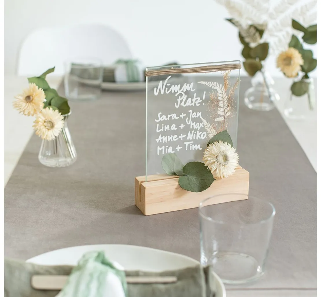 Eine super Deko für den Trend mit Trockenblumen. Verschiedene Blumen und Gräser lassen sich in die Löcher stecken und schaffen einen stilvollen Effekt. Ein hübsch verzierter Dekoring mit Schleifenbändern, Schriftzügen und weiteren getrockneten Pflanzen kann ebenfalls in den Schlitz gesteckt werden und sorgt für einen klasse Hingucker. Auch für Fotos, Gruß-, Speise- oder Platzkarten bestens geeignet. So können einzigartige Tischdekorationen für Hochzeit, Geburtstag, Konfirmation und vieles mehr gestaltet werden.