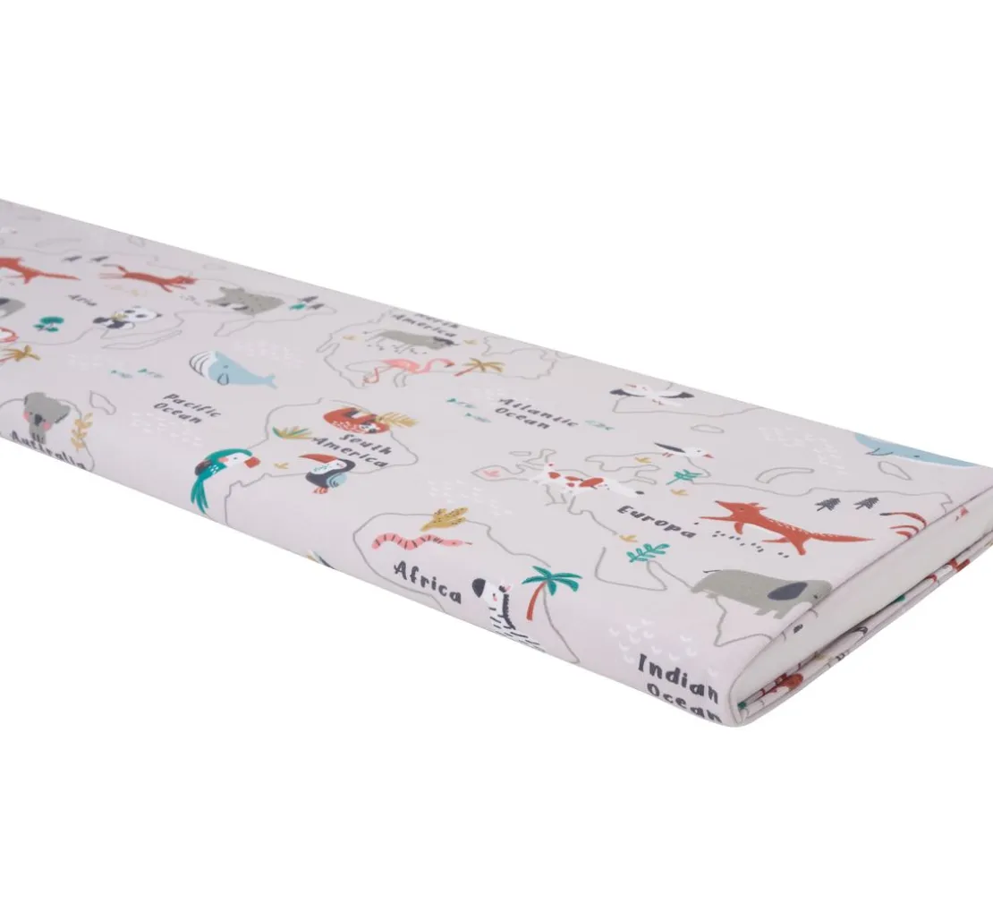 Dieser Jersey-Stoff „Weltreise“ hat eine Breite von ca. 150 cm mit einem Stoffgewicht von ca. 190 g/m². Das Material besteht aus 96 % Baumwolle und 4 % Elastan. Durch den hohen Anteil an Baumwolle ist der Stoff angenehm auf der Haut und besitzt einen glatten Griff. Ein bequemer Begleiter für alle Tage.