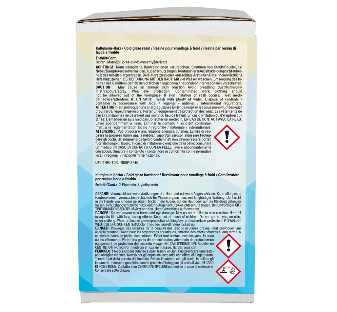 Die Kaltglasur-Packung, 500 ml, besteht aus 2 Komponenten, aus Harz und Härter. Das Mischverhältnis beträgt 1:1. Es handelt sich hier um eine transparente, dünnflüssige Lasur, die zusätzlich beliebig mit Harz-Abtönfarben eingefärbt werden kann. Eine Klebebeschichtung, die auf Glas, Keramik, Holz, Metall, Styropor, Leder und Textilien haftet. Während die Glasur nach dem Zusammenmischen sehr dünnflüssig ist und für die Imprägnierung von Textilien, Vlies- oder Glasfasergewebe geeignet ist, verändert sich die Viskosität mit zunehmender Zeit und wird dickflüssiger. Zum Schluss kann sie sogar auf senkrecht stehenden Gegenständen aufgespachtelt werden. Die Vorreaktionszeit beträgt ca. 30-40 Minuten. Dann ist die Glasur leicht dickflüssig und kann auf Schachteln oder Broschen bis zu 2 mm hoch aufgetragen werden. Durch diesen Vorgang bekommen die Oberflächen eine fantastische Tiefenwirkung, die wie emailliert wirken.