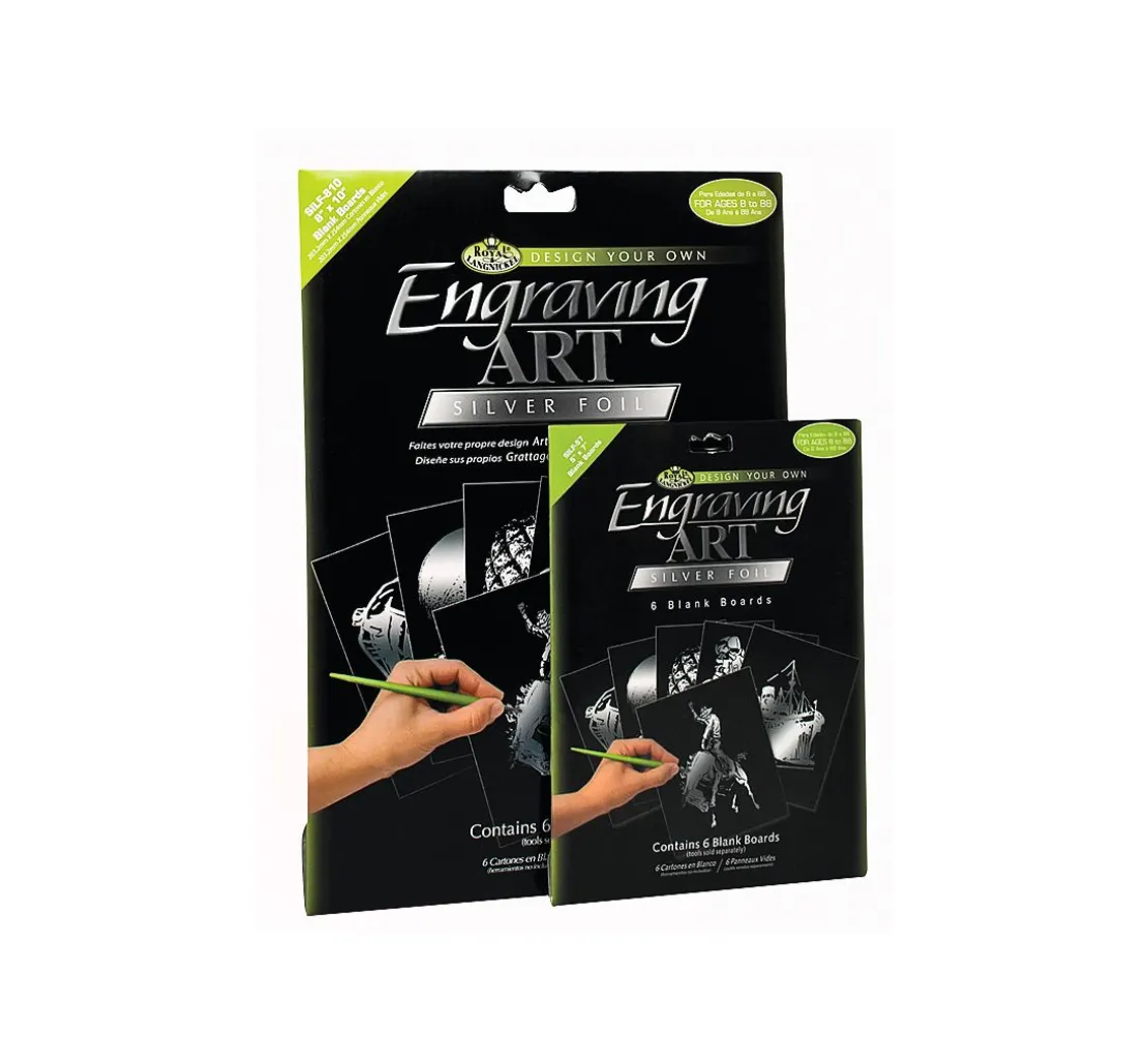 Du erhältst sechs leere Kratzbilder, die mit einer silbernen Metallfolie auf einem stabilen Pappkern bezogen und mit schwarzer Farbe überzogen sind. Diese Kombination bietet dir endlose Möglichkeiten, eigene Motive, Schriften und Symbole hervorzubringen und deine persönliche „Kratzschrift“ zu perfektionieren.