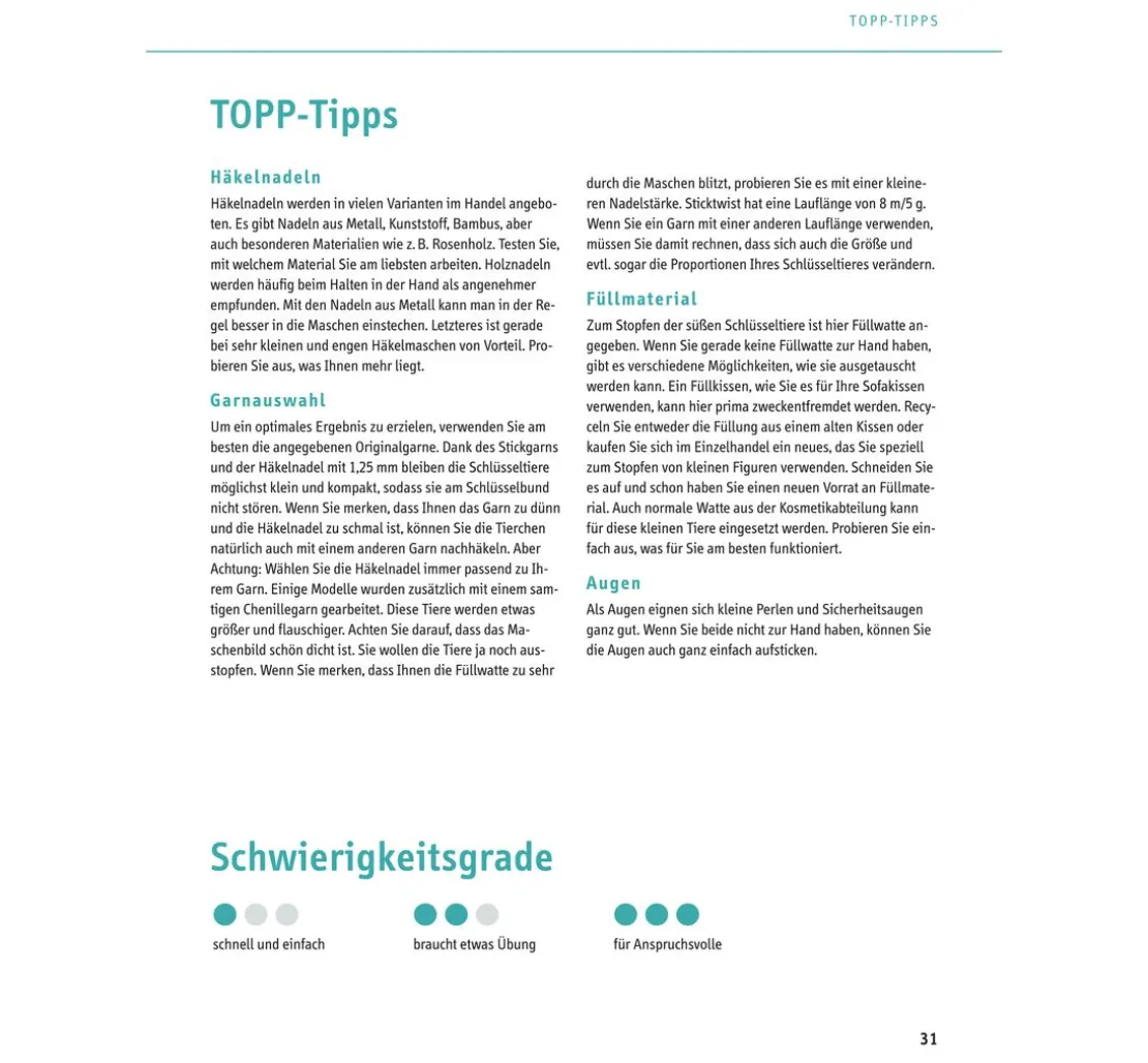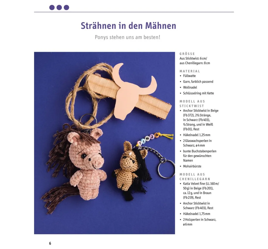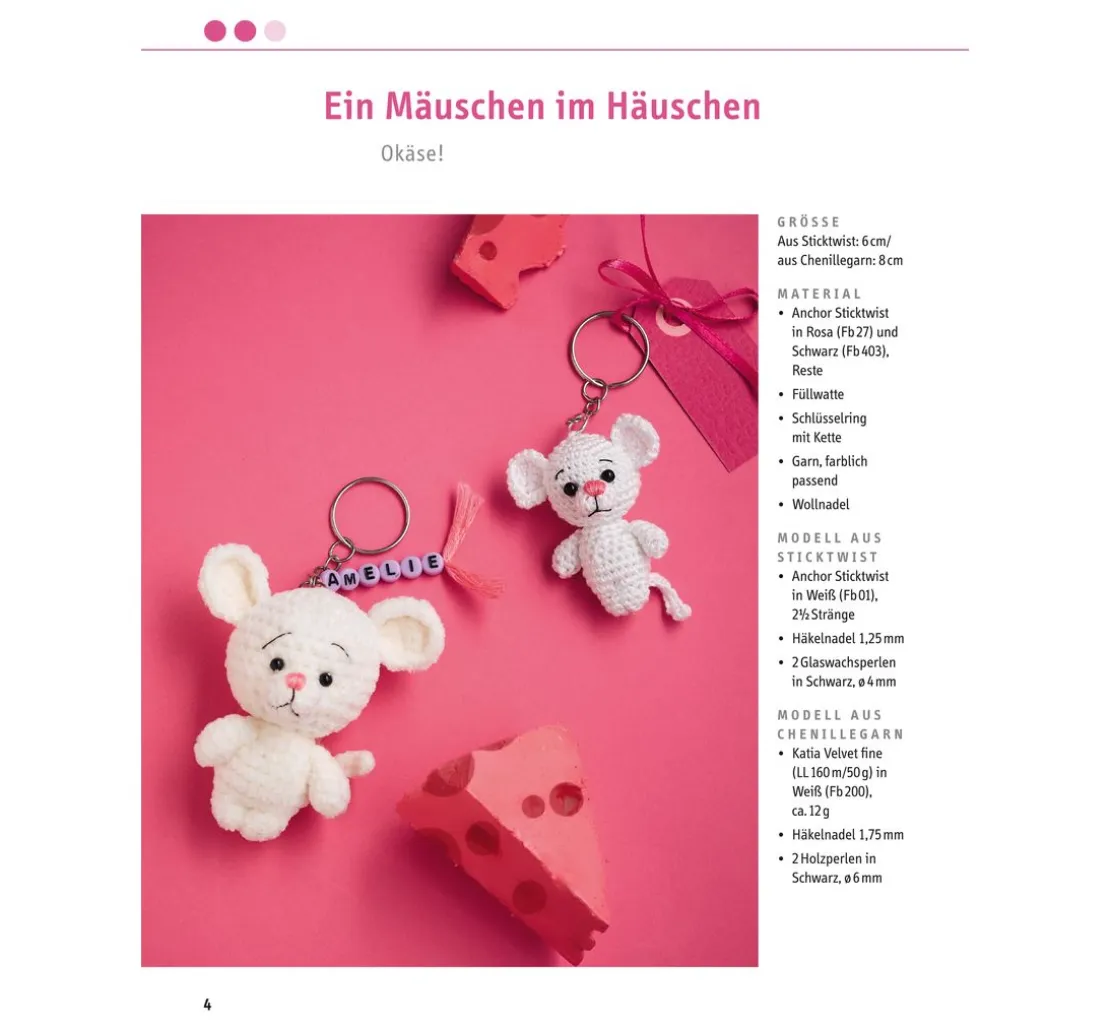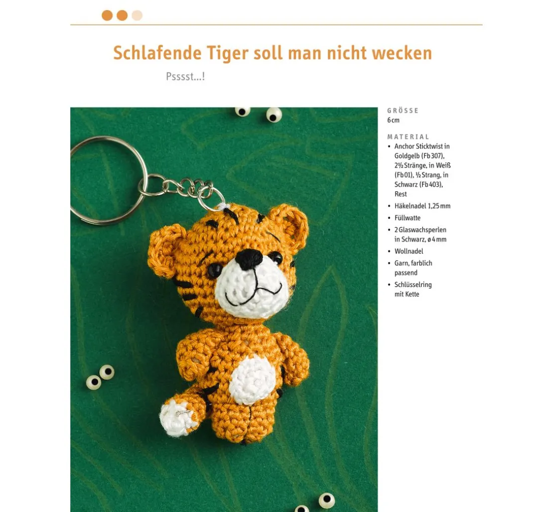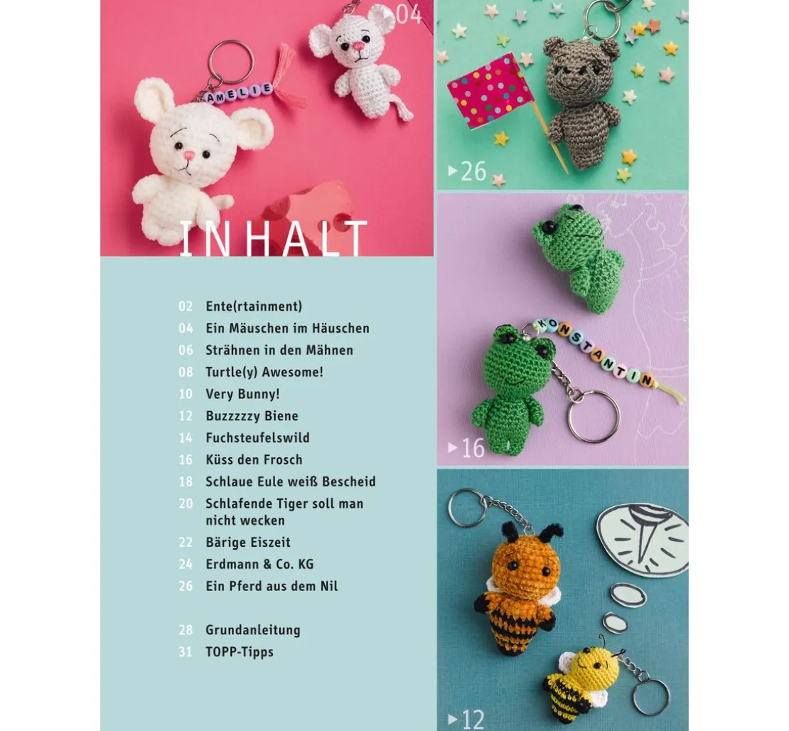 Zudem gibt es ein Anleitungsbuch mit 32 Seiten für weitere süße Häkelminis zum Nachhäkeln. So kannst du Eisbär, Tiger, Fuchs und Co. als perfekte Begleiter für den Alltag herstellen und mit einem Schlüsselring immer dabei haben.
