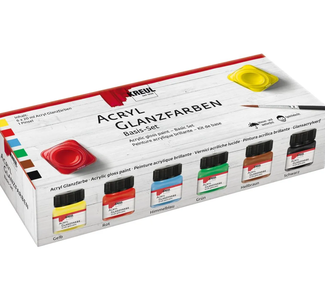 KREUL Acryl Glanzfarben als Basis-Set sind perfekt als Zusammenstellung für alle, die hochglänzende Farbbrillanz für Ihre Bastelidee benötigen.