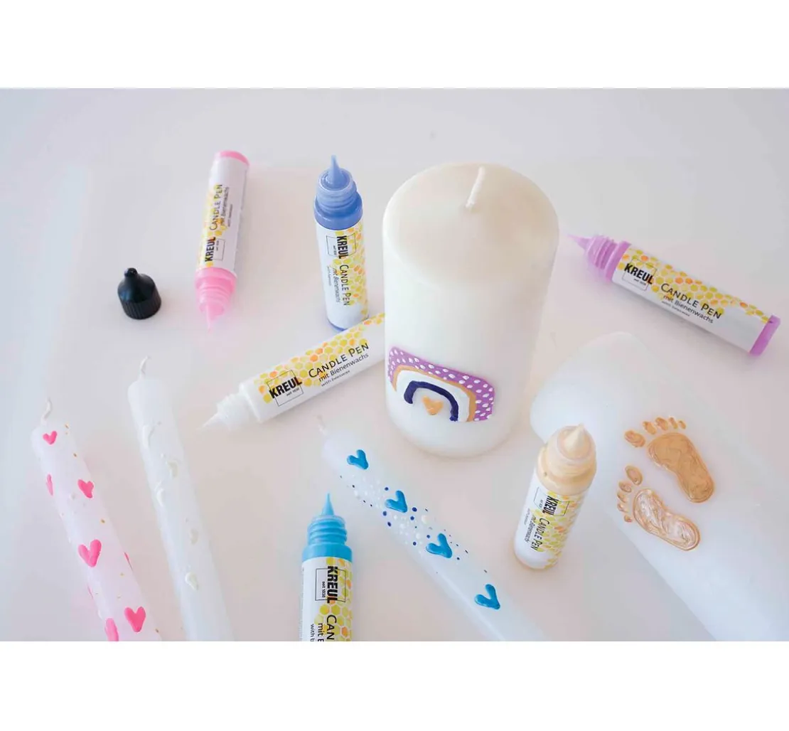 Das KREUL Candle Pen „Hello Baby“ ist ein Must-Have für alle Bastelfans und Kreativliebhaber. Mit diesen flüssigwachshaltigen Farben auf Wasserbasis kannst du deine Kerzen und Wachsplatten ganz individuell gestalten und verzieren. Das Besondere an diesem Set, ist die handliche Stiftform mit feiner Malspitze, die ein direktes Bemalen der Kerzen ermöglicht. Die Farben können auch mit verschiedenen Auftragswerkzeugen wie Pinsel, Malschwamm oder Spachtel verwendet werden. Besondere Effekte entstehen, wenn du die Farbe schichtweise übereinander aufträgst oder du Malschablonen verwendest – so kannst du auch ganz einfach Motive auf deine Kerze auftragen.