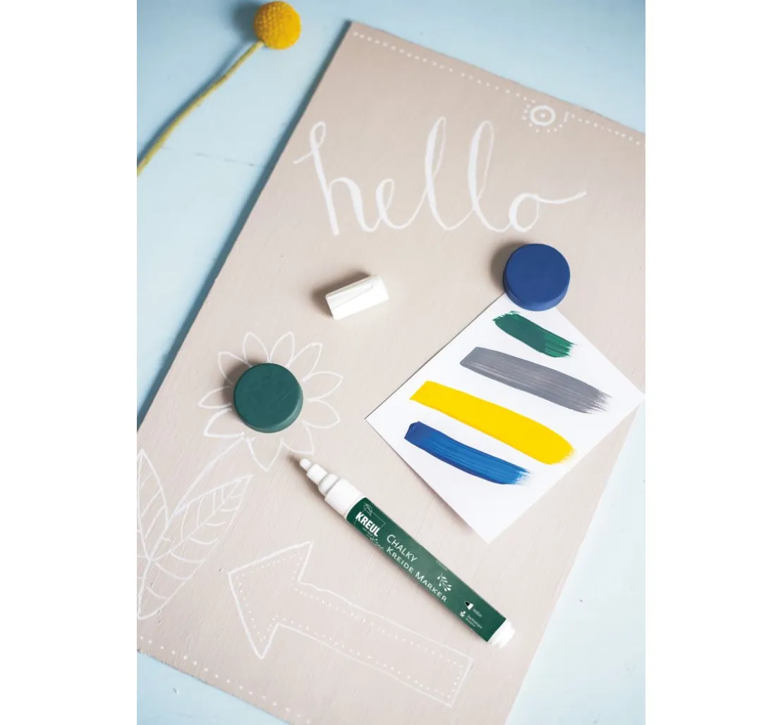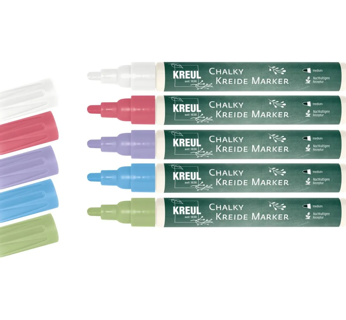 Die Stifte von der Marke KREUL eignen sich perfekt zur Tafelbeschriftung oder z.B. auf Whiteboards oder an Scheiben. Die Strichstärke von ungefähr 2-3 mm ist perfekt auch für filligrane Zeichnungen. Die Farbe ist schnelltrocknend, auf Wasserbasis und deckend. Einfach mit einem feuchten Tuch oder Schwamm kann die Flüssigkreide abgewischt werden. Die Spitze kann herausgenommen und gereinigt werden.
