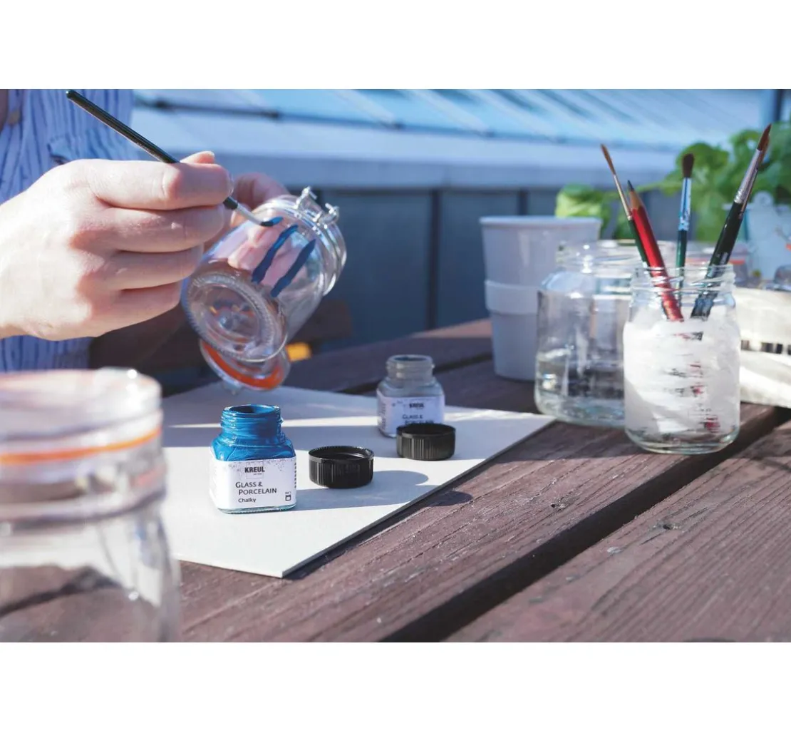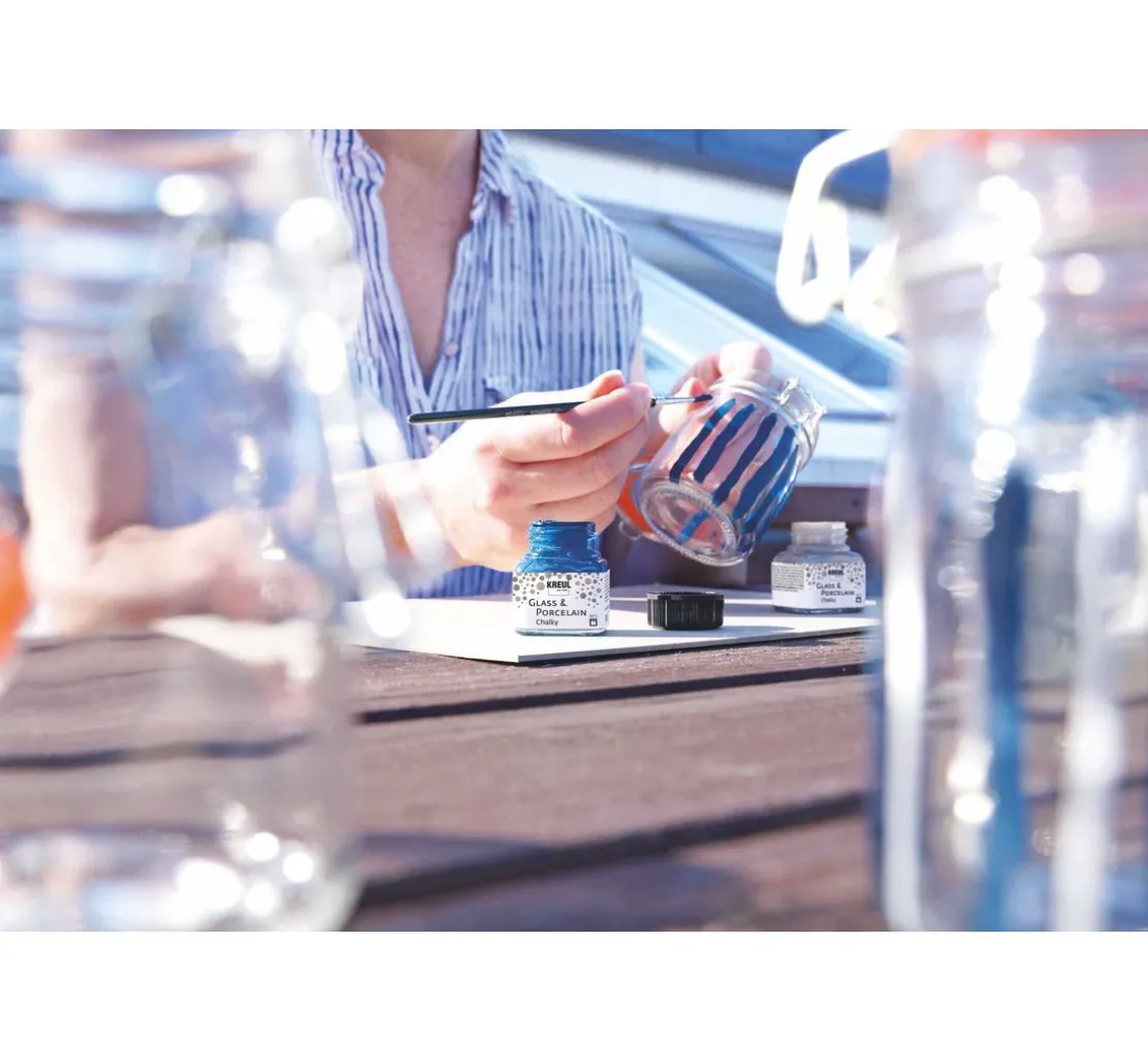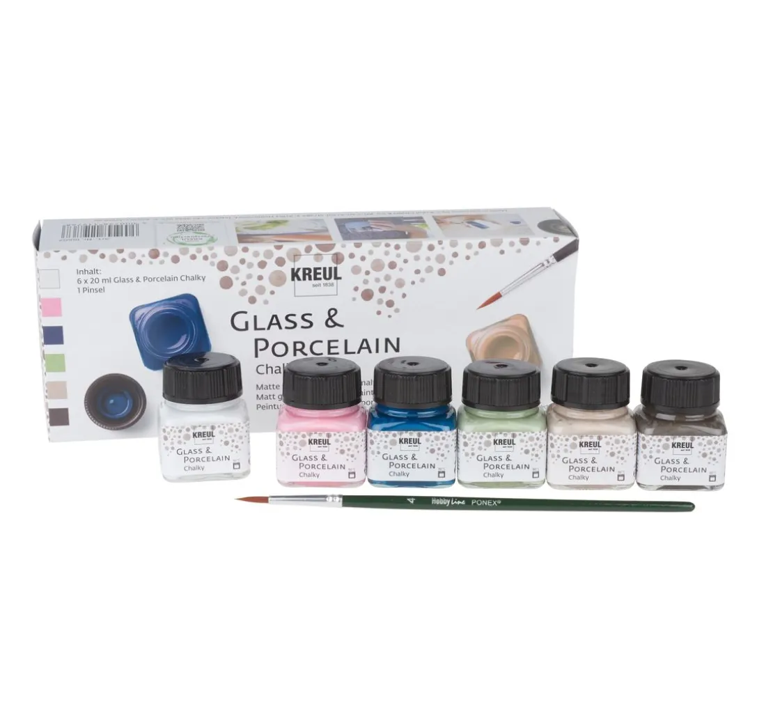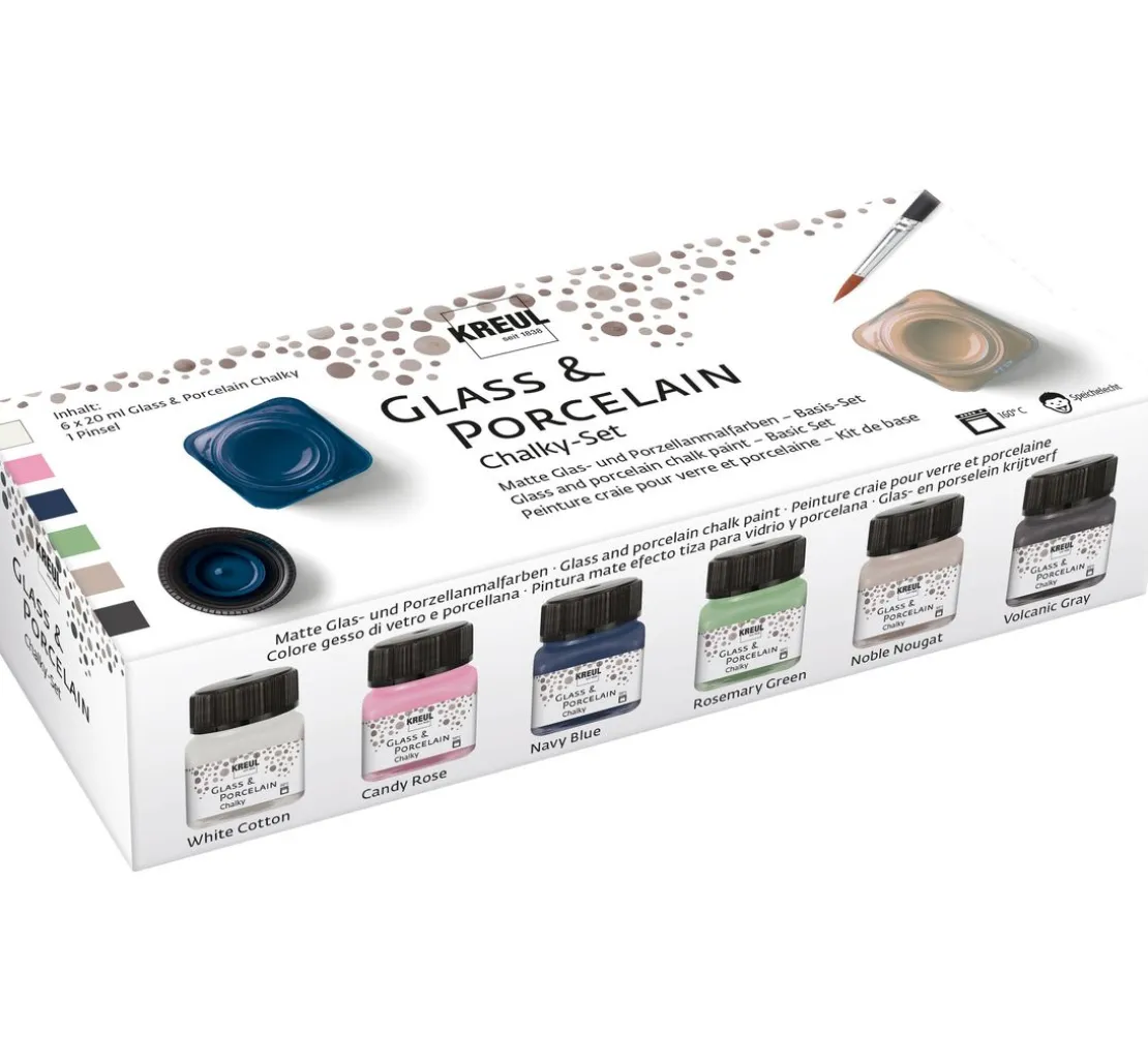 Den trendigen Chalky-Effekt gibt es nun auch für hitzebeständige und glatte Materialien. Das KREUL Glass & Porcelain „Chalky-Set„ beinhaltet eine Auswahl der beliebtesten Farben, mit denen Glas und Porzellan mit einer samtig, matten Oberfläche dekoriert werden kann.