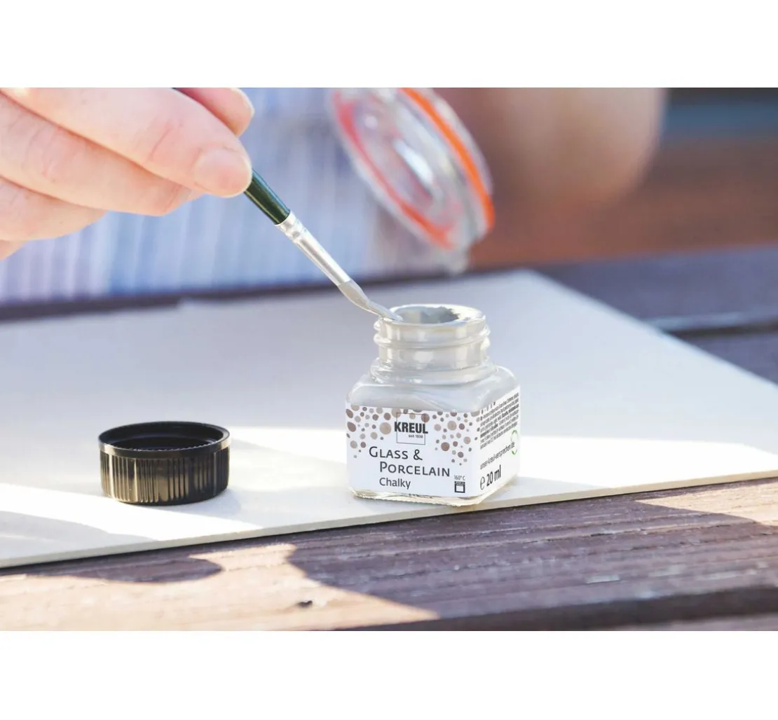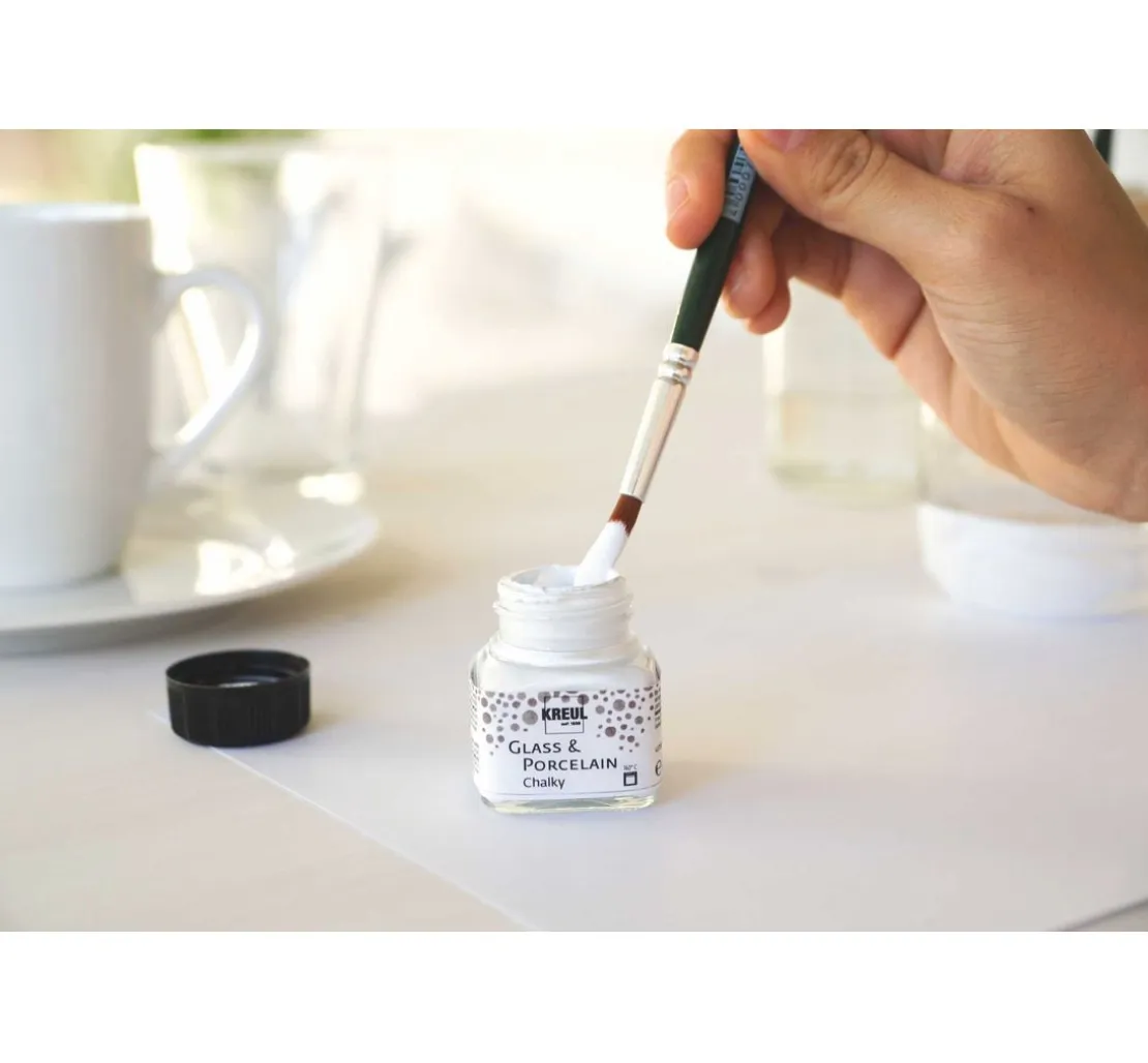 Die KREUL Glass & Porcelain „Chalky„ Farbe besteht zu mindestens 60 % aus nachhaltigen Rohstoffen natürlichen Ursprungs und ist auf Wasserbasis hergestellt. Die Farbe ist gut deckend und trocknet mit einer Kreide-Optik matt auf. Die KREUL Glass & Porcelain „Chalky„ Farbe lässt sich hervorragend mit den anderen Varianten der KREUL Glass & Porcelain Serie kombinieren. So lassen sich einzigartige Designs und verschiedene Akzente setzten. Für vielfältige Aquarell-Effekte und zum Verdünnen der Farbe sollte der KREUL Glass & Porcelain „Farbverdünner„ verwendet werden, der die Haftkraft der Farbe nach dem Einbrennen nicht beeinträchtigt.