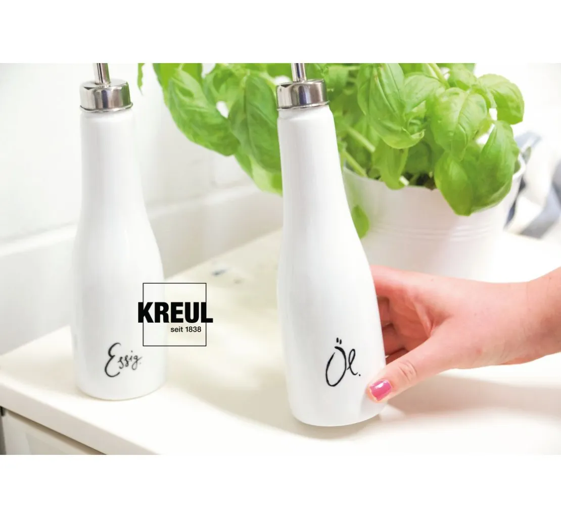Die KREUL Glass & Porcelain „Classic„ Farbe ist auch für nicht dauerhaften Halt geeignet. Solange die Farbe nicht eingebrannt ist, kann die Bemalung mit Wasser einfach wieder abgenommen werden. So gestalten Sie temporäre Designs auf vielen Kunststoffen, Spiegel und Acrylglas, die wie echt glasierte Keramik wirken.