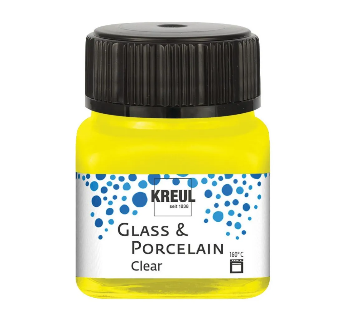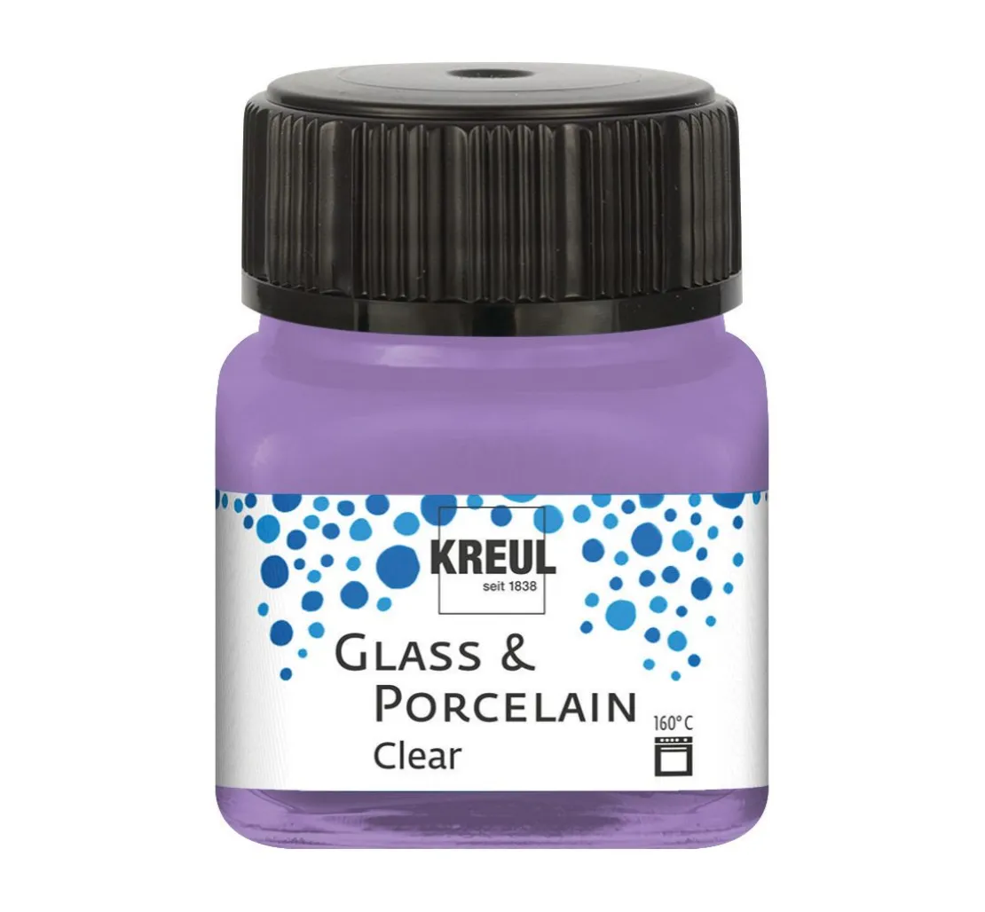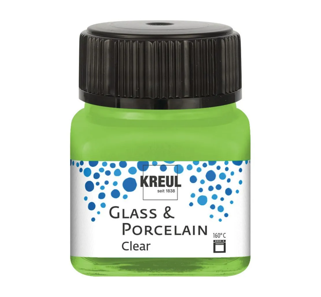 Die KREUL Glass & Porcelain „Clear„ Farbe ist auf Wasserbasis hergestellt und besteht zu mindestens 60 % aus nachhaltigen Rohstoffen natürlichen Ursprungs. Die zunächst milchige Farbe trocknet transparent, glasklar und glänzend auf. Die verschiedenen Farben lassen sich toll kombinieren und mit dem Kreul Glass & Porcelain „Farbverdünner„ beliebig verdünnen. Die Oberfläche muss sauber, fettfrei und glatt sein. So entstehen ganz individuelle Aquarelleffekte und einzigartige Gegenstände.