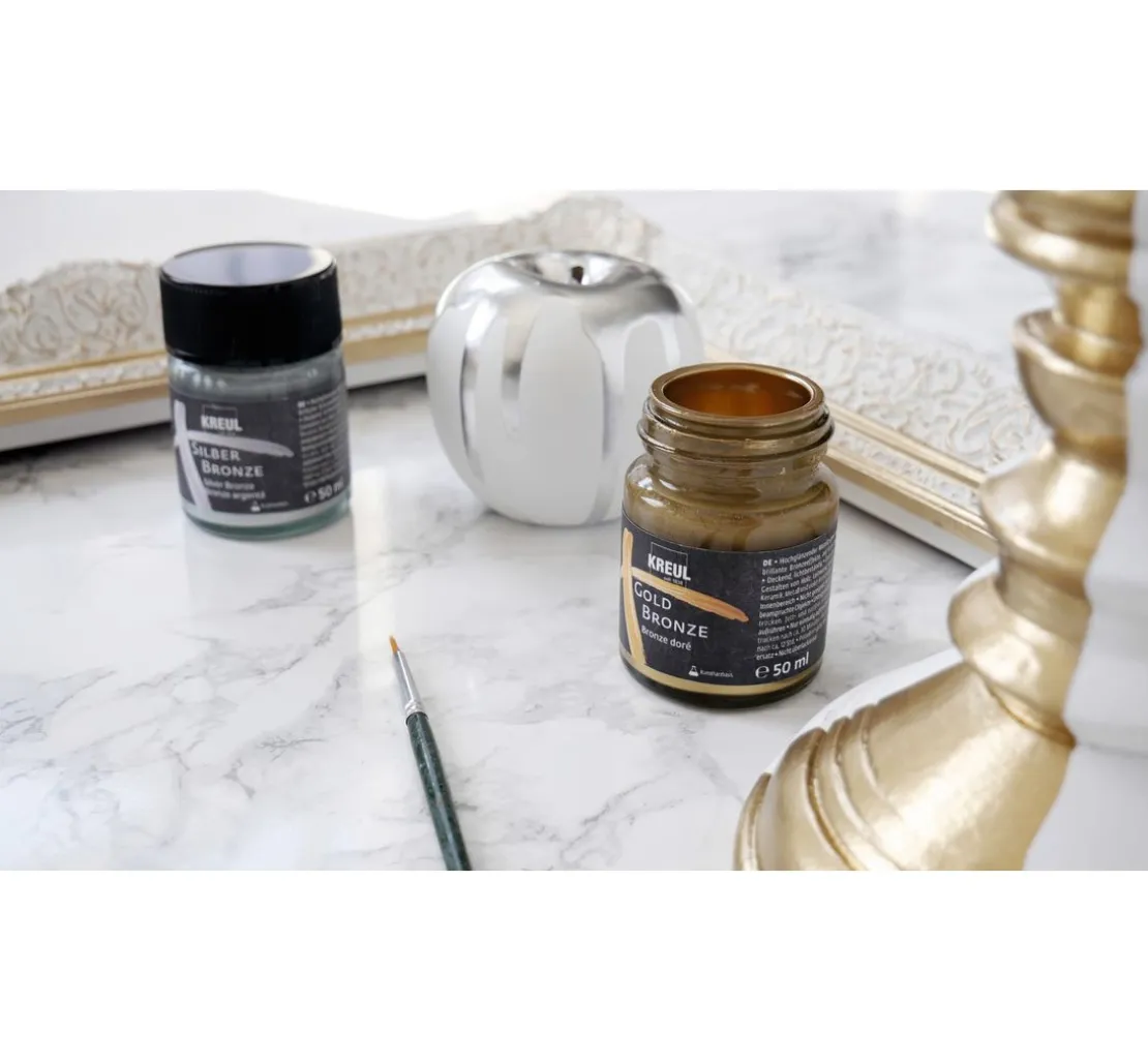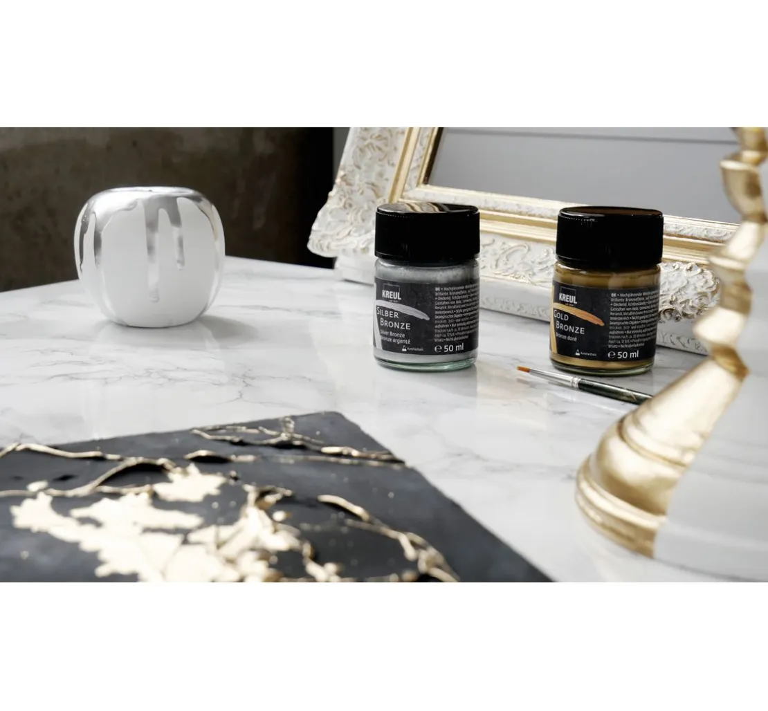 Mit KREUL Silber Bronze schaffen Sie ein Wohnambiente mit dem gewissen Etwas. Durch einen behutsamen Auftrag von Flüssigbronze werden Bilderrahmen, Schalen und viele weitere Dekorationen zum schimmernden Blickfang. Die traditionelle Technik wird für Restaurationen angewendet und verleiht Liebhaberstücken wieder einen luxuriösen Touch.