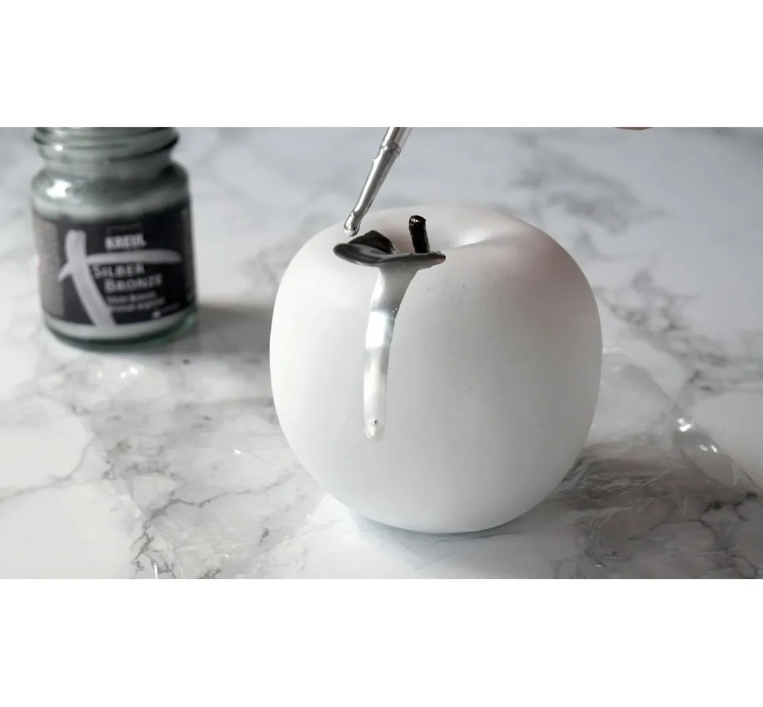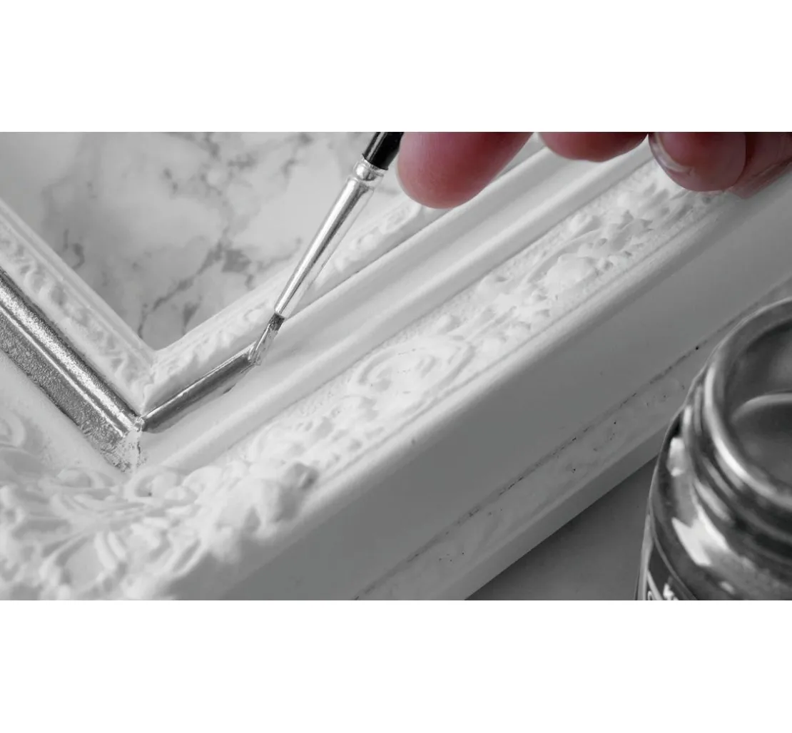 Der Metallpigmentlack wird einfach mit dem Synthetikpinsel aufgetragen und schafft brillante Bronzeeffekte in Silber. Werden auch Sie kreativ und geben Ihren alten Kerzenleuchtern oder Bilderrahmen eine zweite Chance, sich in schimmerndem Silber zu präsentieren.