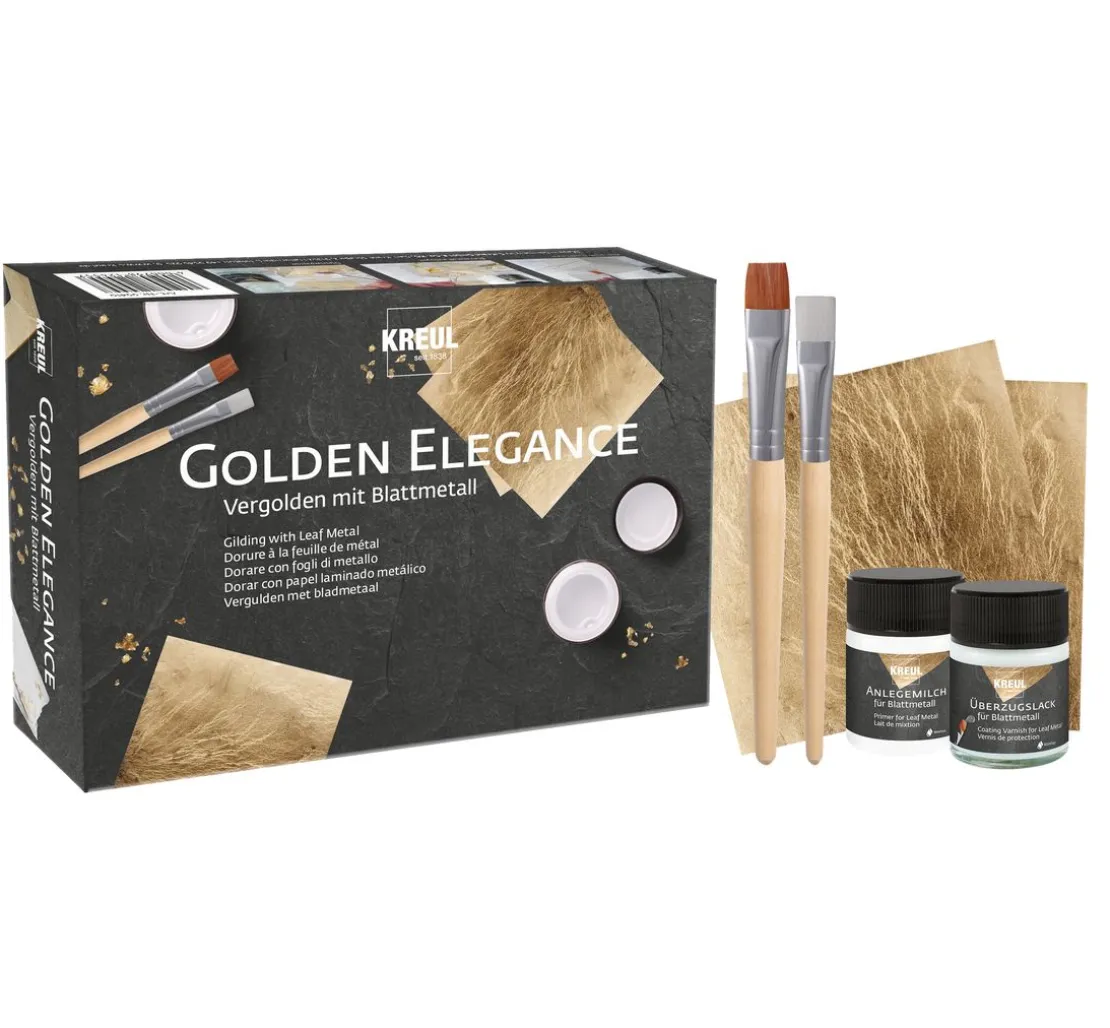 Mit dem Set KREUL Vergolden mit Blattmetall „Golden Elegance“ erhalten Sie alle benötigten Materialien zum Veredeln Ihrer Accessoires. Ideal geeignet für sowohl flächiges Malen, Tropfen und zum Spiel mit dem Pinsel- bzw. der Untergrundstruktur. Eine Anleitung für die Verwendung der einzelnen Komponenten ist in dem Set enthalten, somit kann jeder ohne Vorkenntnisse einfach in die Welt des Blattmetalls eintauchen.