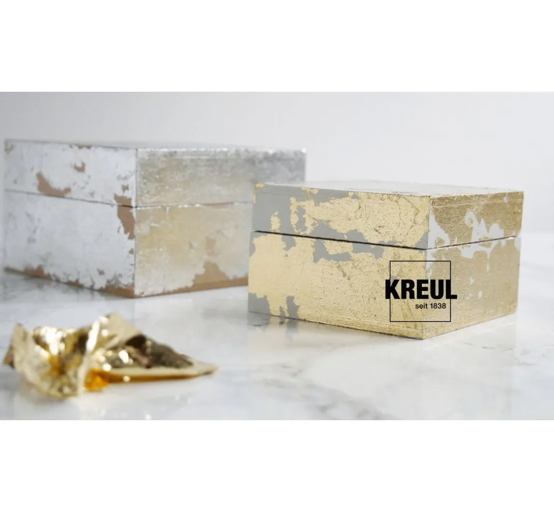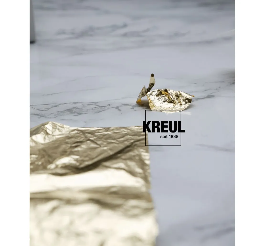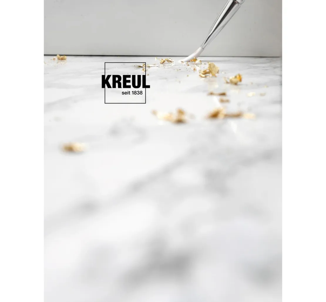 Verarbeitung: Die KREUL Anlegemilch wird mit dem dunklen Pinsel auf die entsprechene Fläche aufgetragen. Hier kann sowohl flächig als auch datailliert gearbeitet werden. Wenn die Anlegemilch transparent aufgetrocknet ist (ca. 20 Minuten), wird das Blattmetall mit hilfe des trockenen, hellen Pinsels auf die Oberfläche aufgelegt und leicht angedrückt. Reste vorsichtig mit einem Pinsel oder einem Tuch entfernen.
