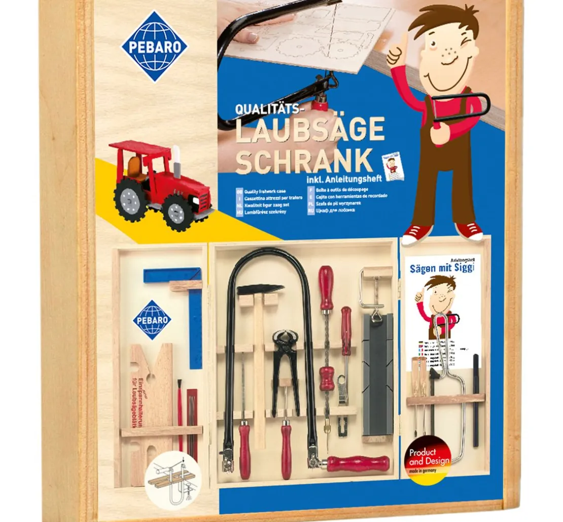 In einem stabilen Holzschrank (36,5 cm x 29,5 cm) bietet dir dieses Set alles, was du für präzise Laubsägearbeiten benötigst: von der klassischen Laubsäge über einen Laubsägetisch und Zwinge bis hin zu nützlichen Helfern wie Laubsägeblättern und einem Spannschlüssel. Die enthaltenen Werkzeuge wie Drillbohrer, Gehrungslade, Hammer, Zange und Schraubendreher eröffnen dir unzählige Möglichkeiten für deine Projekte.