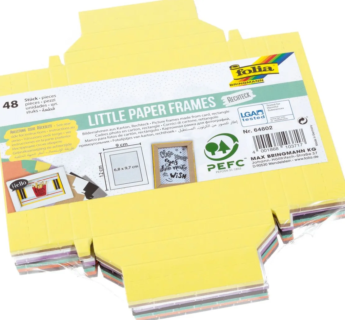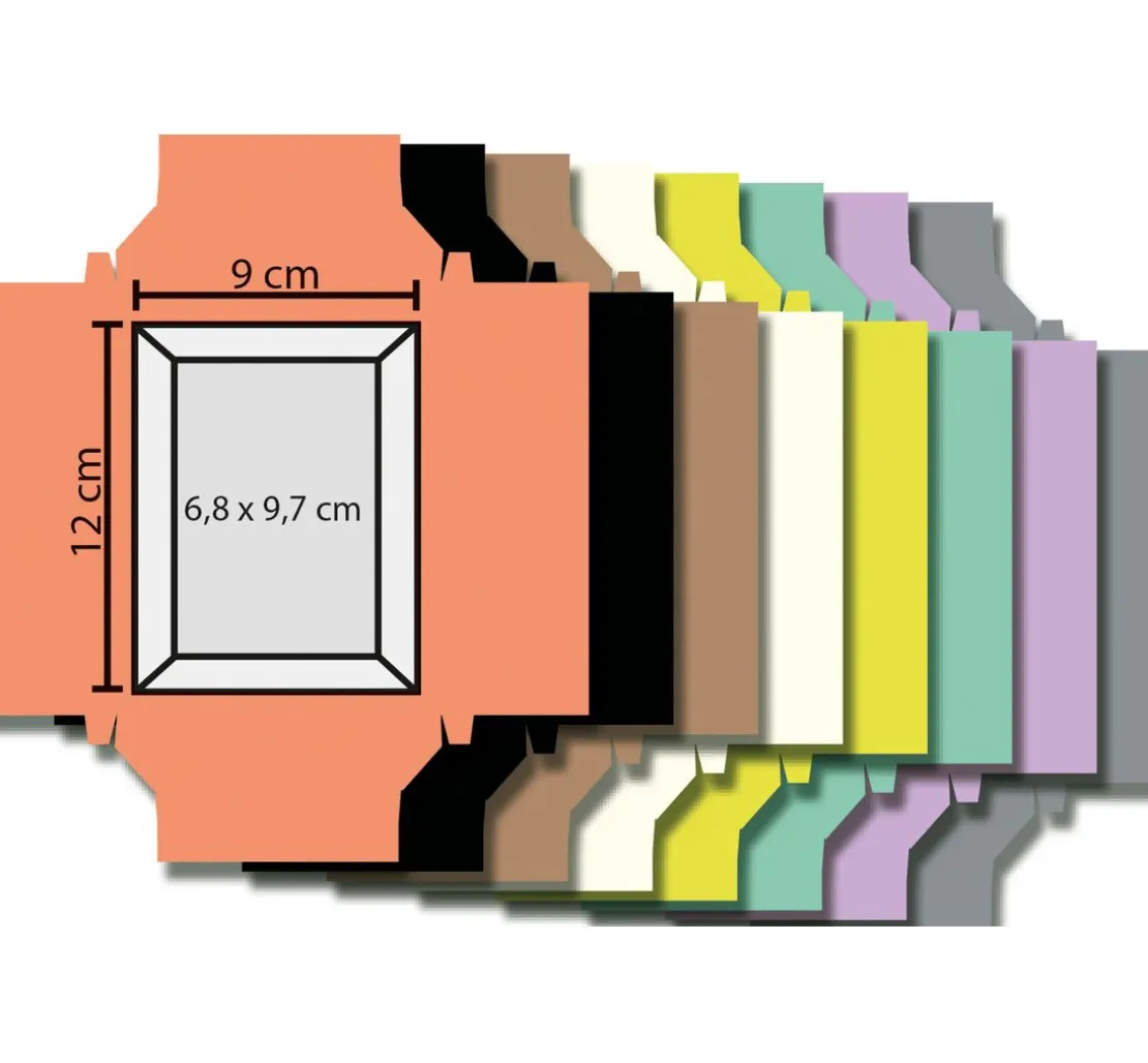 Die Little Paper Frames, 48 Stück, sind vorgefalzt in den Farben Grau, Orange, Grün, Schwarz, Lila, Creme, Braun und Gelb. Je Farbe erhalten Sie 6 Stück. Der Ausschnitt ist ca. 6,8 x 9,7 cm groß, der Bilderrahmen hat gefaltet eine Größe von ca. 12 cm x 9 cm. Das Material ist Fotokarton. Inklusive Anleitung in Bildern.
