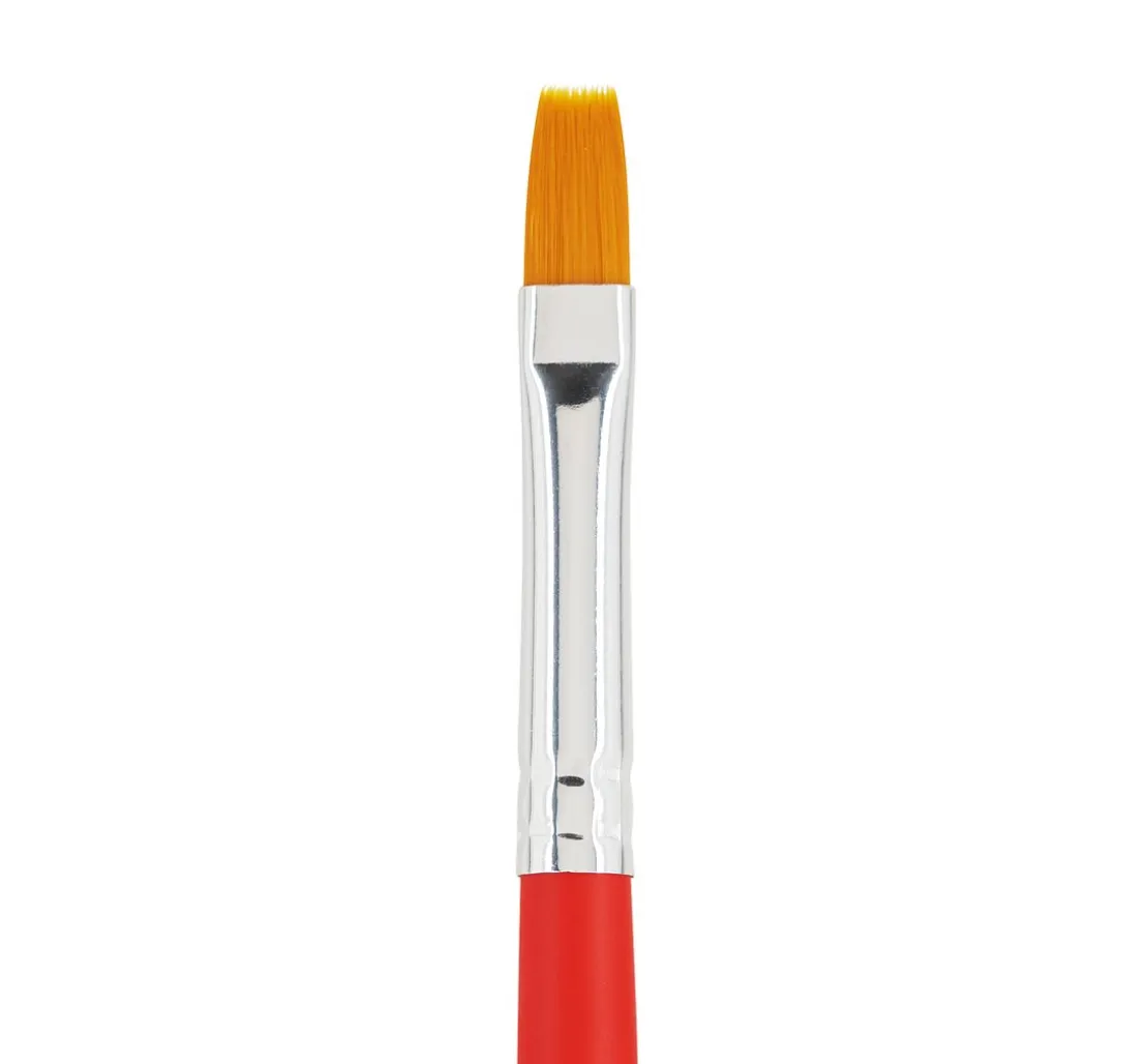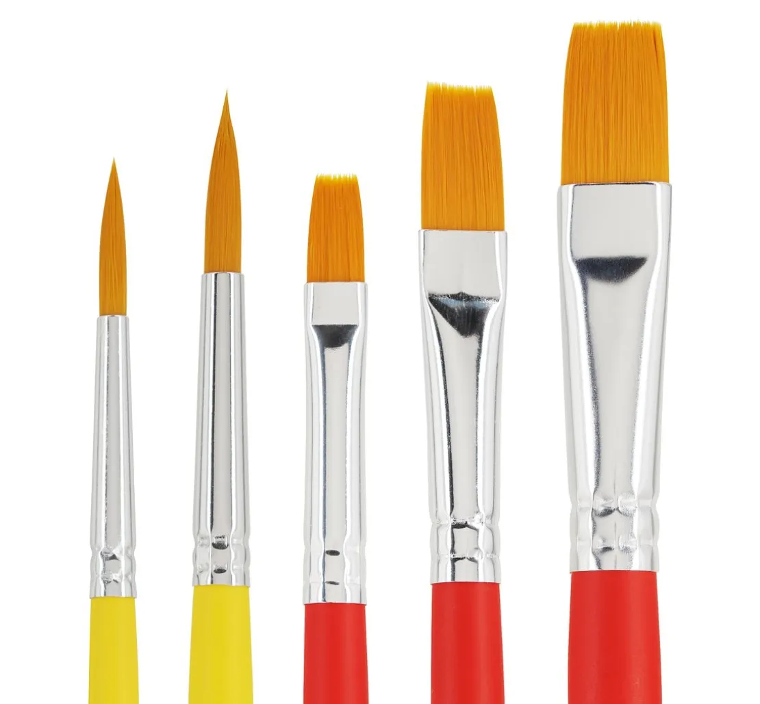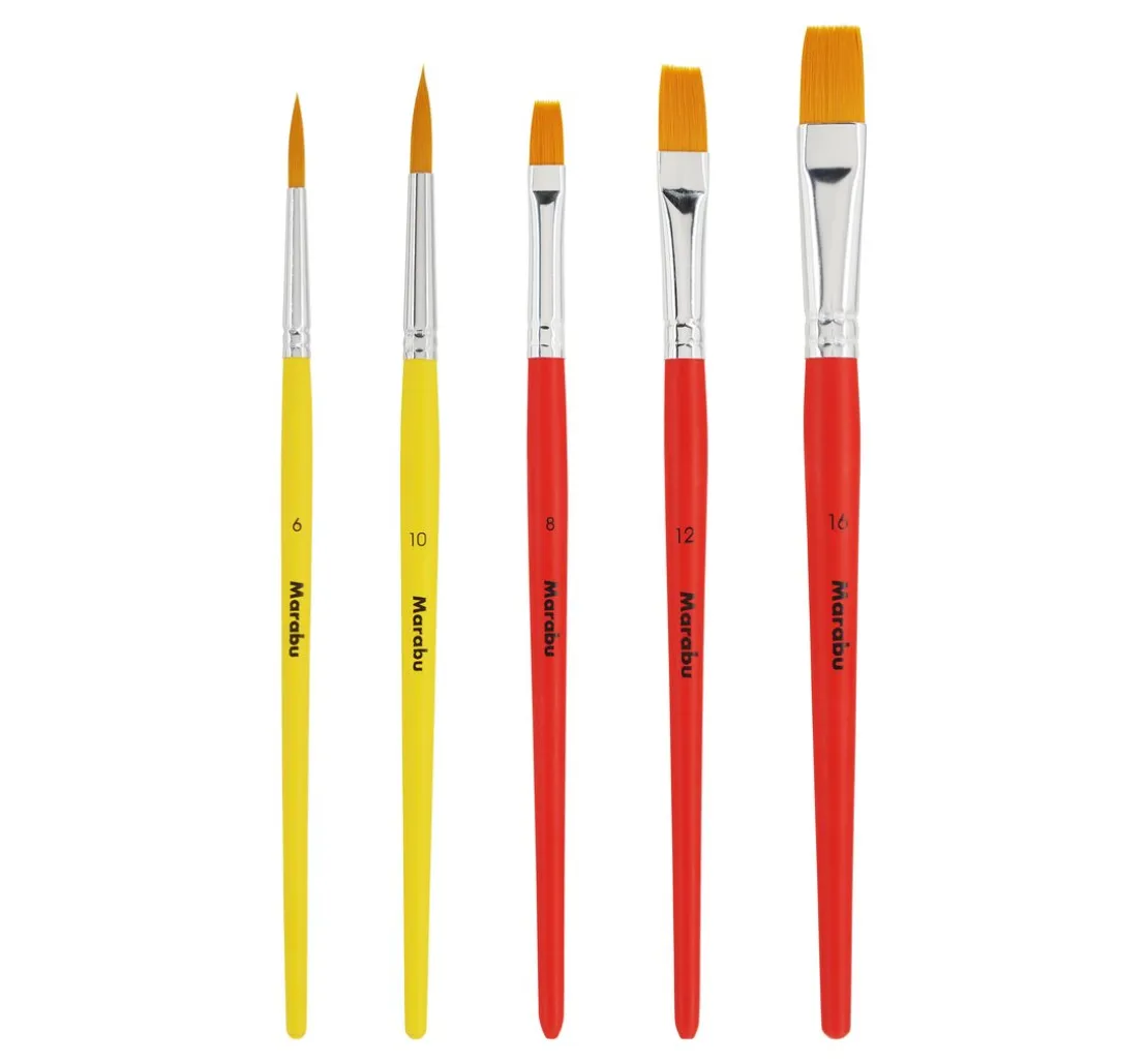 Mit dem Set erhältst du 3 flache Synthetikhaarpinsel in den Größen 8, 12 und 16 sowie 2 runde Synthetikhaarpinsel in der Größe 6 und 10.