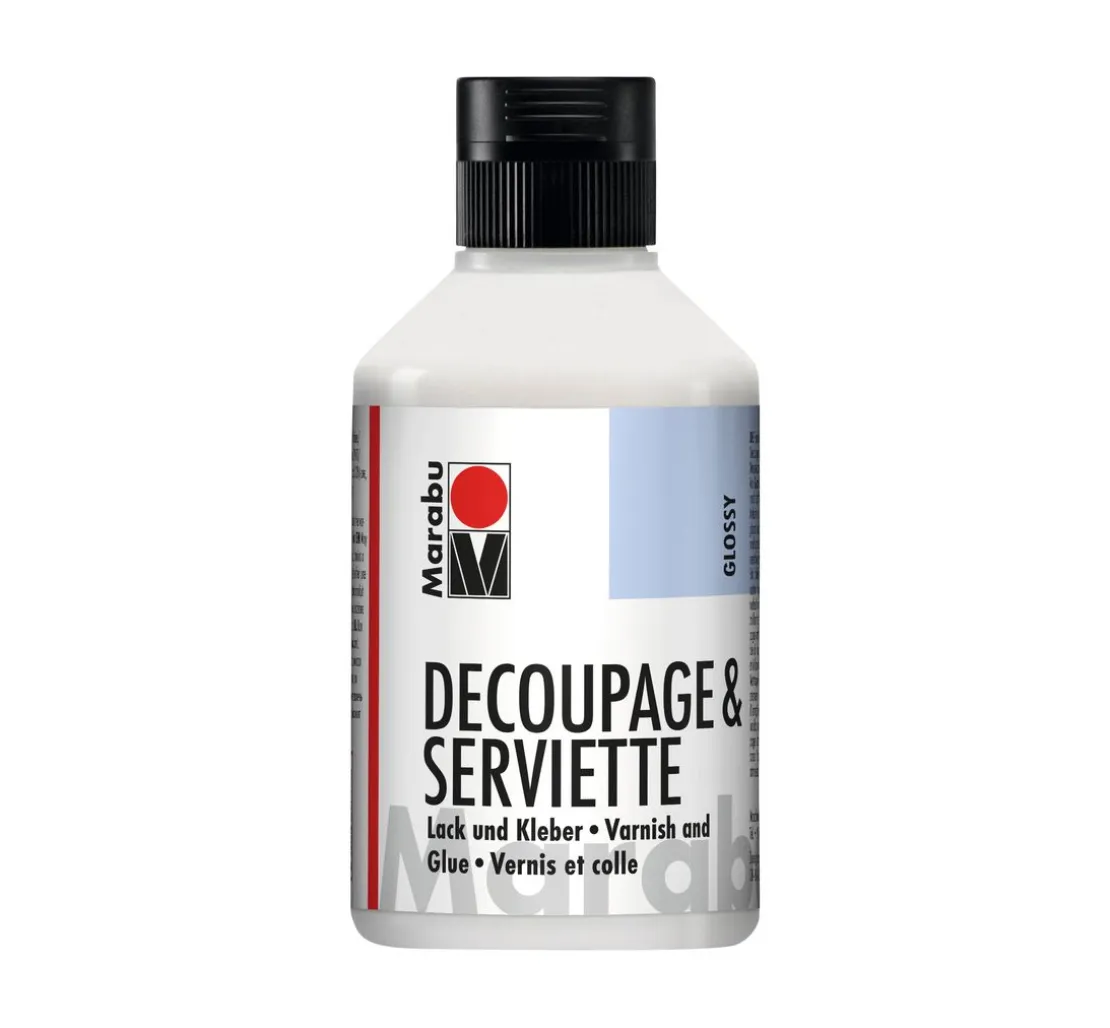 Marabu Serviettenlack und Kleber trocknet transparent, ist wischfest und witterungsbeständig und auf Wasserbasis.