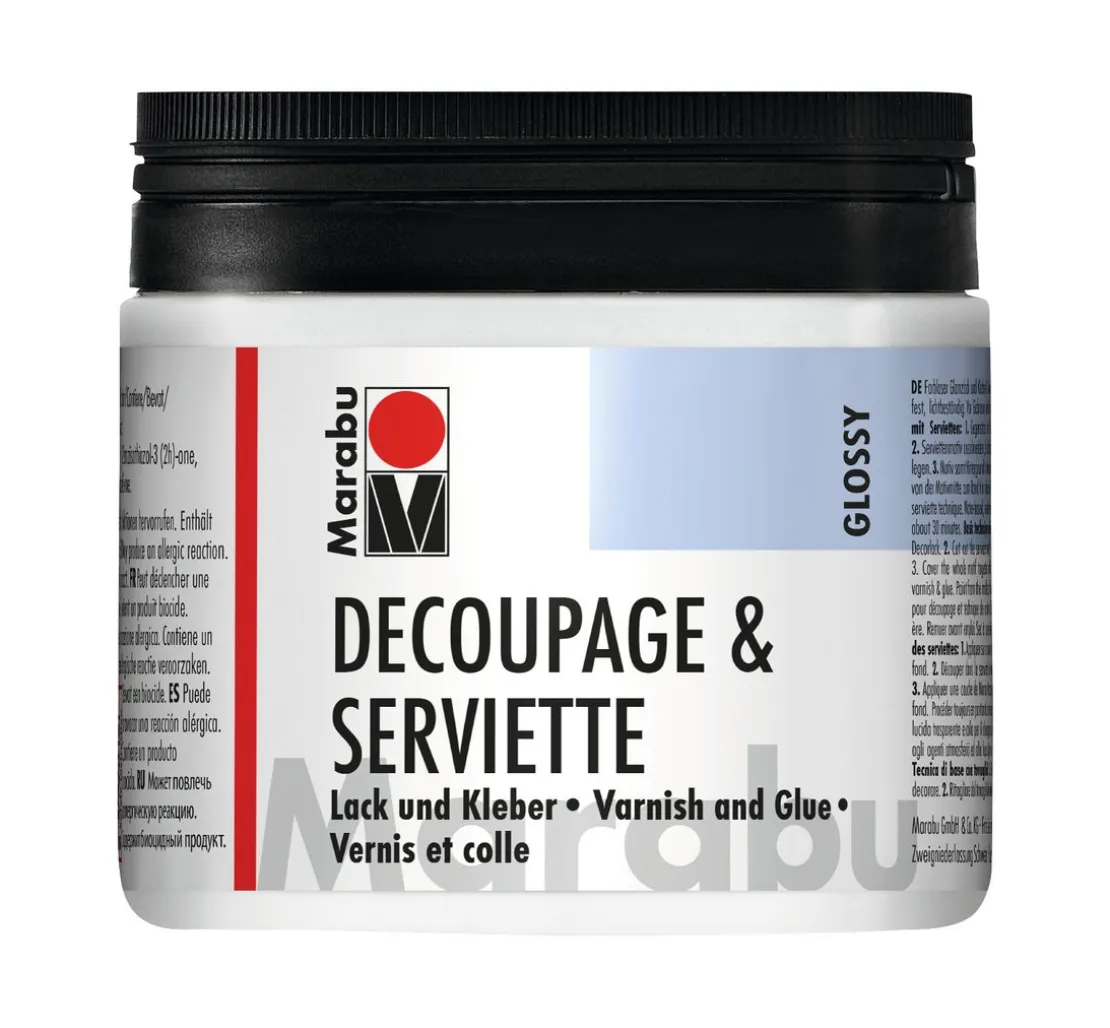 Mit Marabu-Serviettenlack + Kleber verwandelst du zusammengeschnittene Servietten in wahre Kunstwerke! Der glänzende Lack sorgt dafür, dass die Serviettenmotive perfekt auf deinen selbst gestalteten Objekten haften bleiben. Ob auf Modelliermasse, Papiermaché, Stein oder Terrakotta – der Serviettenlack von Marabu lässt sich vielseitig einsetzen und verleiht deinen Bastelprojekten den letzten Schliff.
