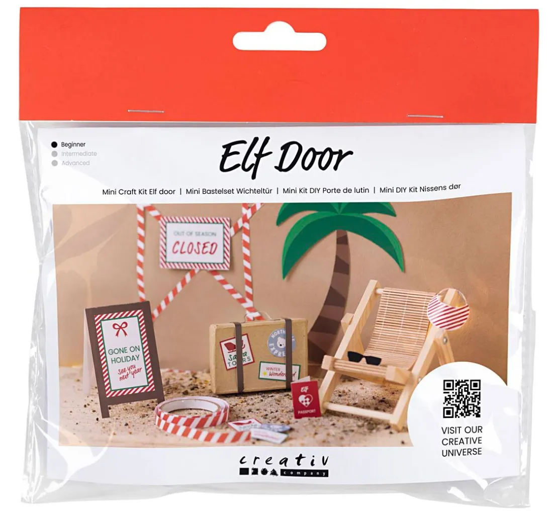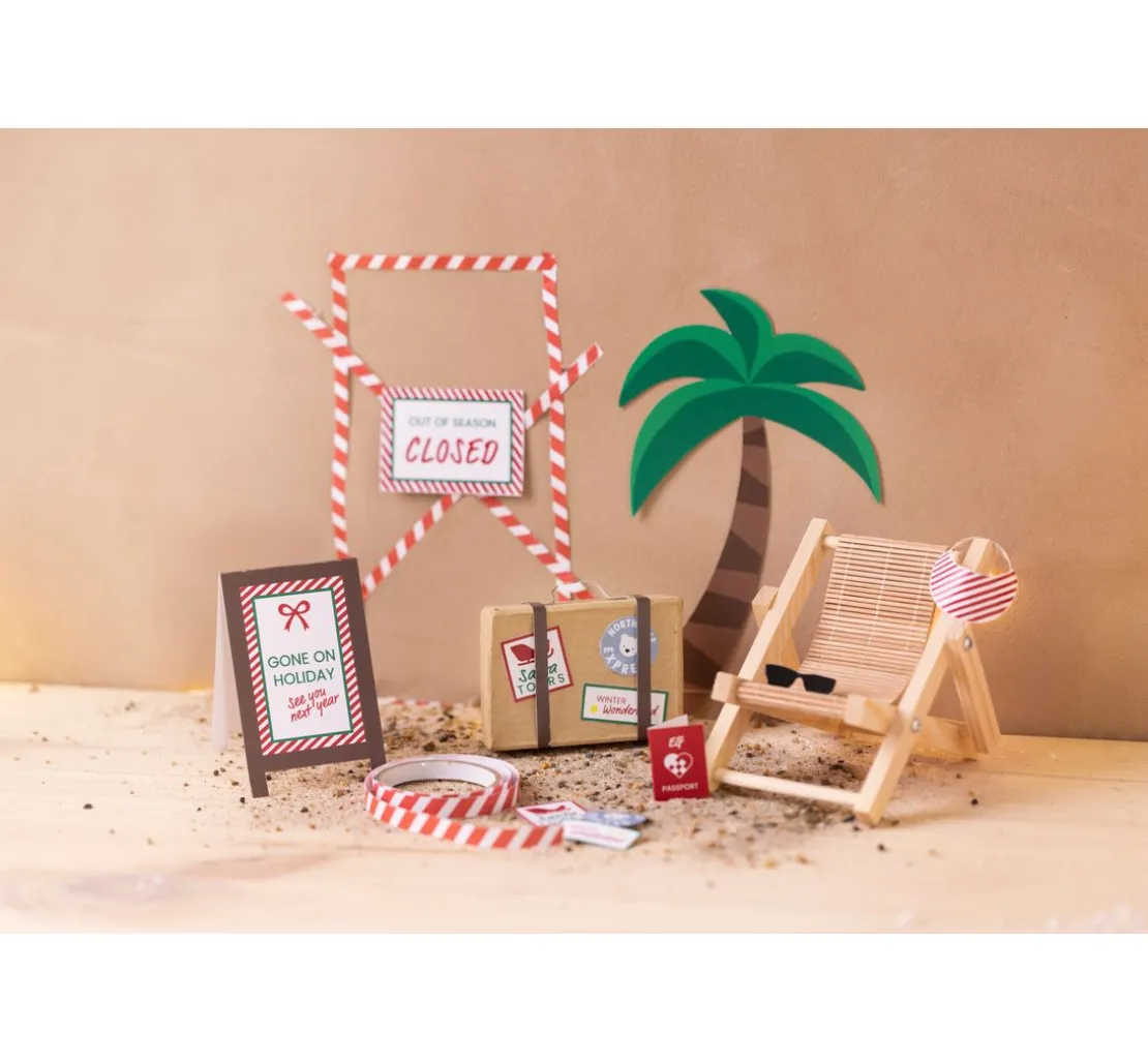 Auch ein kleiner Wichtel braucht mal Urlaub. Mit dem Mini Bastelset Wichteltür „Im Urlaub“ lässt sich eine detailreiche Szene aus Palme, Strandstuhl, Koffer und Accessoires basteln. Auf der Rückseite der Verpackung liefert eine Bildanleitung Inspirationen und Tipps für die Gestaltung.