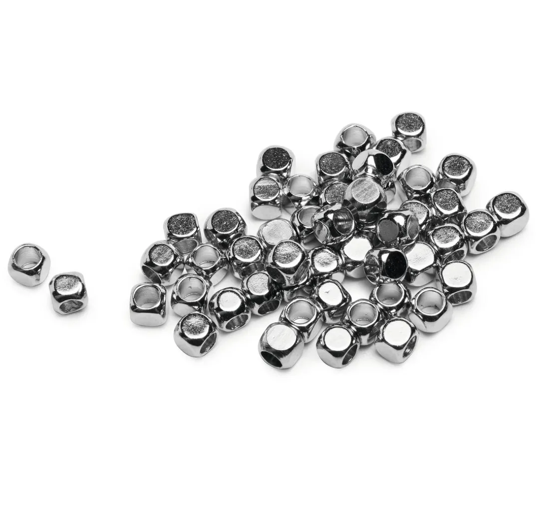 Die Mini Metall-Perlen „Würfel“ haben ein Durchmesser von ca. 2,5 mm und ein Innen-Durchmesser von ca. 1,5 mm. In einer Packung erhalten Sie 50 hübsche Mini Würfel-Perlen.