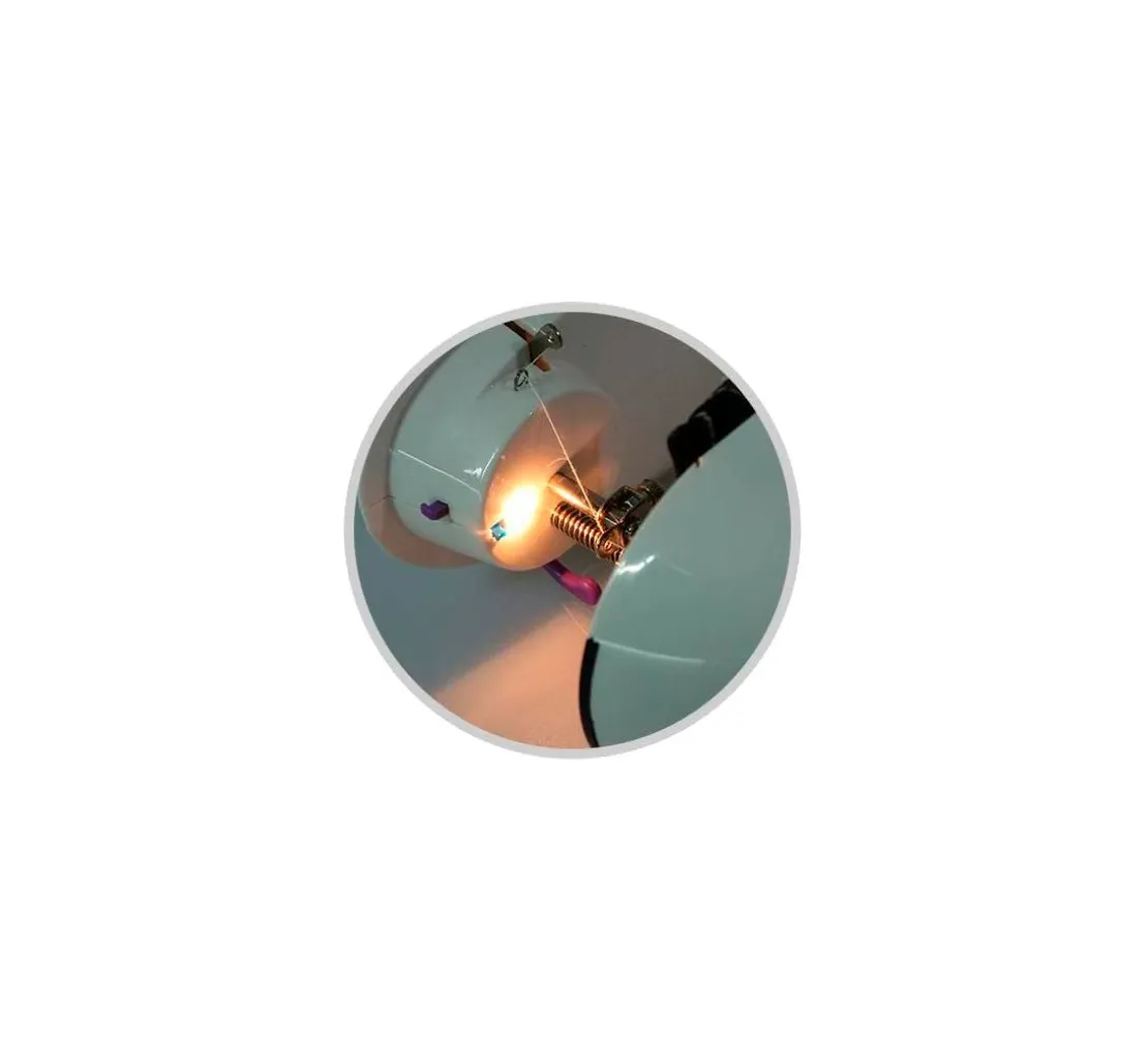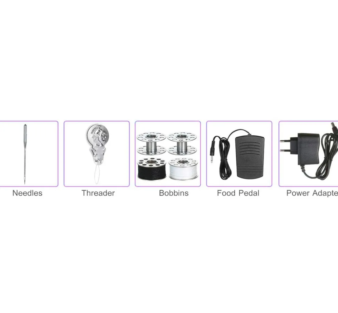 Eine Mini-Nähmaschine mit einer Größe von ca. 19 x 10 x 20 cm und einem Gewicht von ca. 650 g. Die Maschine näht mit zwei Betriebsarten Netz- oder Batteriebetrieb. Nähen mit Strom bei 4,8 W/6V – 88mA oder mit 4 AA-Batterien (nicht im Lieferumfang enthalten). Diese Nähmaschine ist mit 1 Nähprogramm, 2 Geschwindigkeiten, einer Lampe, einem Fadenabschneider und Fußpedal ausgestattet. Dieses Produkt ist kein Spielzeug und nur für den häuslichen Gebrauch bestimmt.