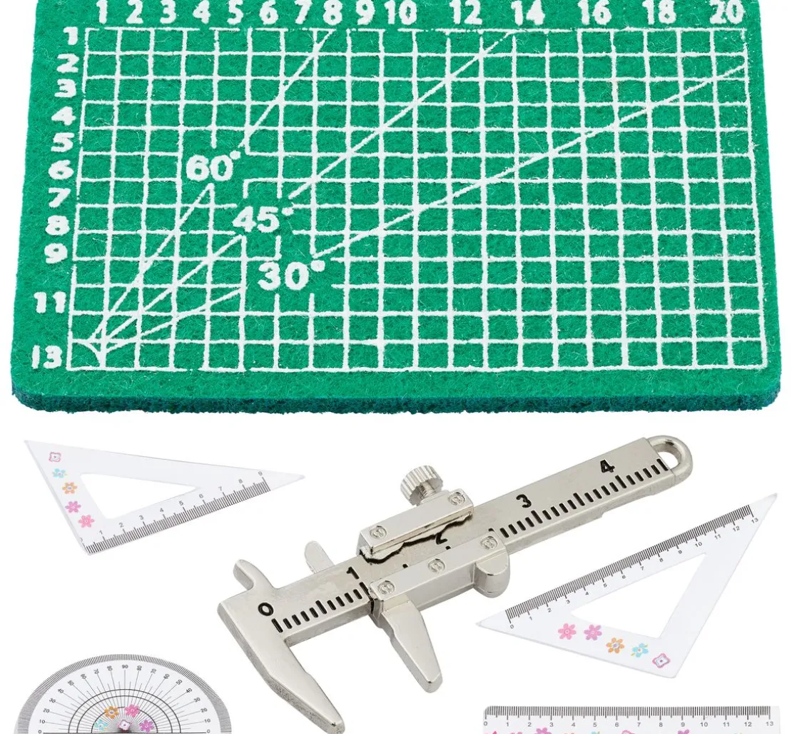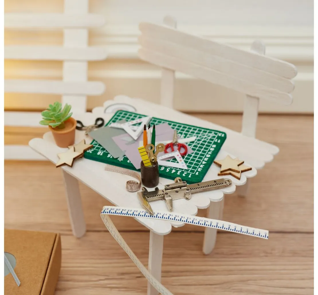 Witziges Miniatur Bastelset bestehend aus verschiedenen Linealen, einer Bastelmatte und einer Schieblehre mit einer Größe von ca. 2 – 7 cm. Insgesamt sind 6 Teile enthalten.