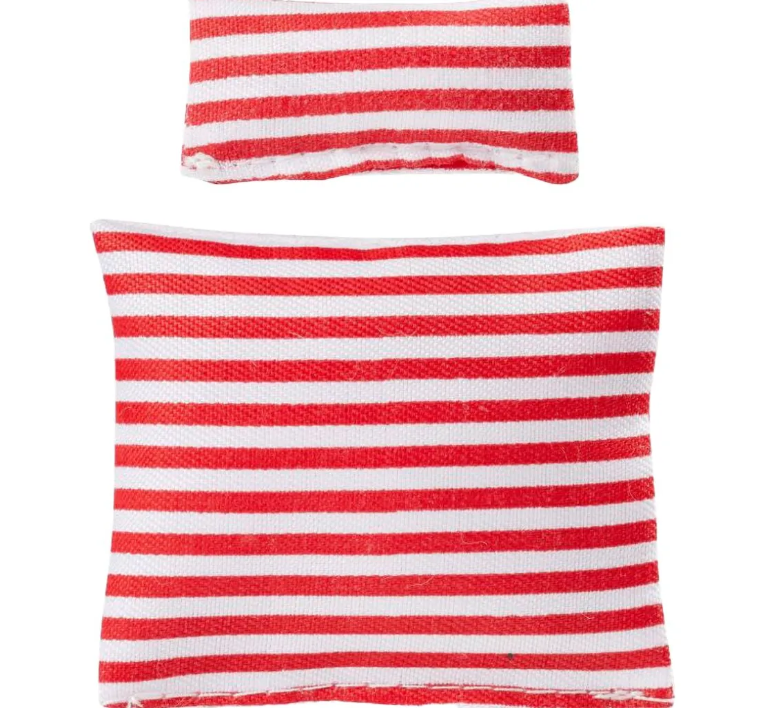 Bring Magie in deine Miniaturwelt mit dieser rot-weiß-gestreiften Miniatur-Bettdecke und dem passenden Kissen. Diese charmanten Accessoires, mit einer Bettdecke von ca. 5,5 x 6 cm und einem Kissen von ca. 4 x 2 cm, sind perfekt für deine Wichtelszenen und Miniaturdarstellungen geeignet.