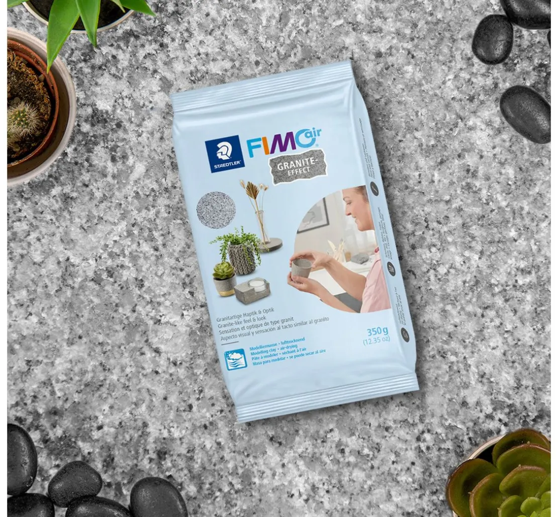 Mit dieser Modelliermasse „FIMOair Granite-Effect“ lassen sich tolle Kunstwerke in granitähnlicher Optik formen. Ein Brennofen ist nicht notwendig, da die Masse lufttrocknend ist. Die Packung beinhaltet ca. 350 g.