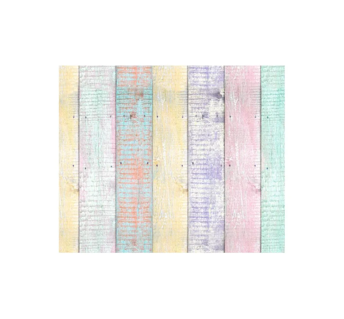 Der Motiv-Fotokarton „Holz Pastell“ mit einer Größe von ca. 49,5 x 68 cm, ist beidseitig mit einem Holzplanken-Motiv bedruckt. Hergestellt wird dieses Papier aus Frischzellulose.