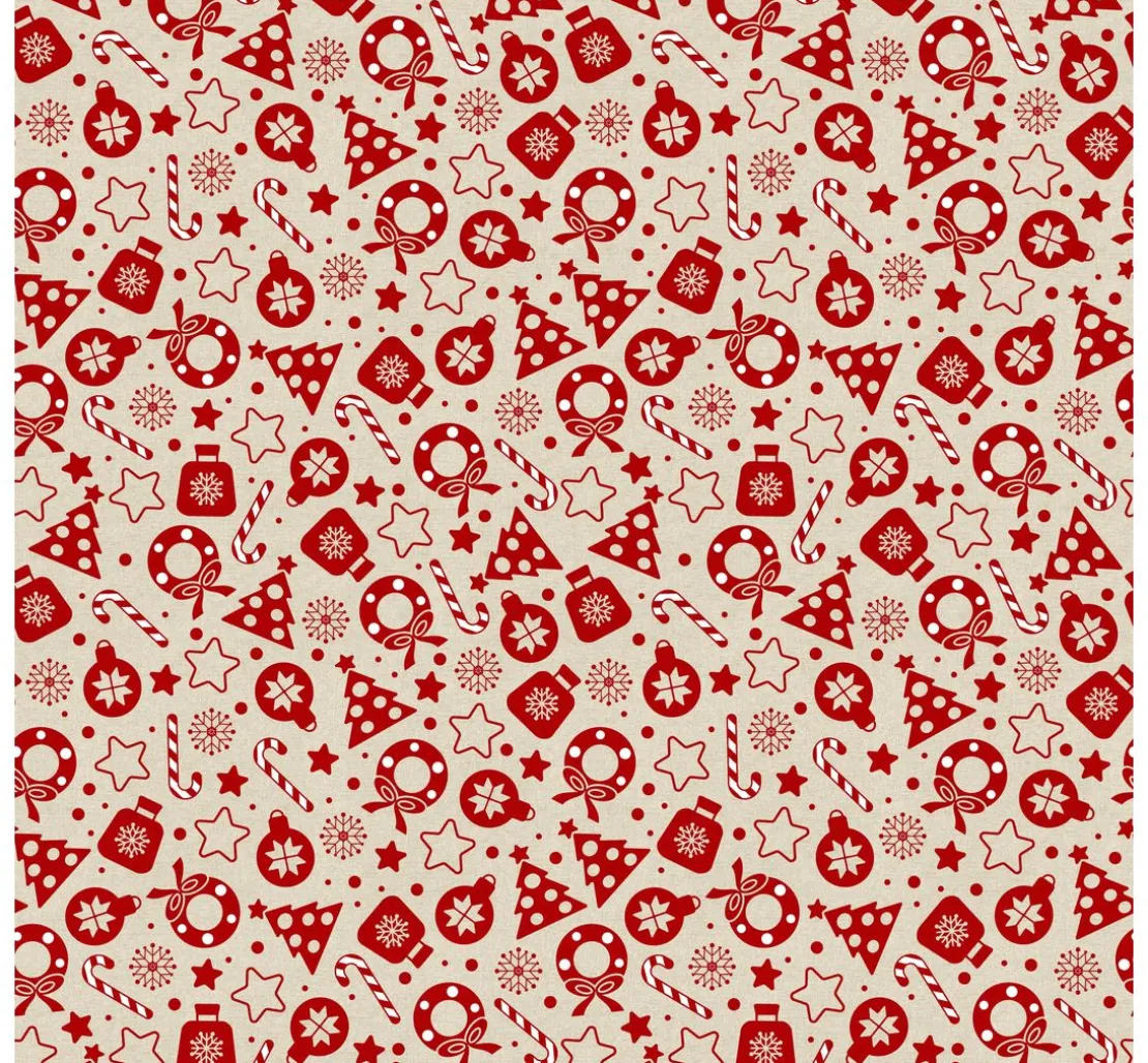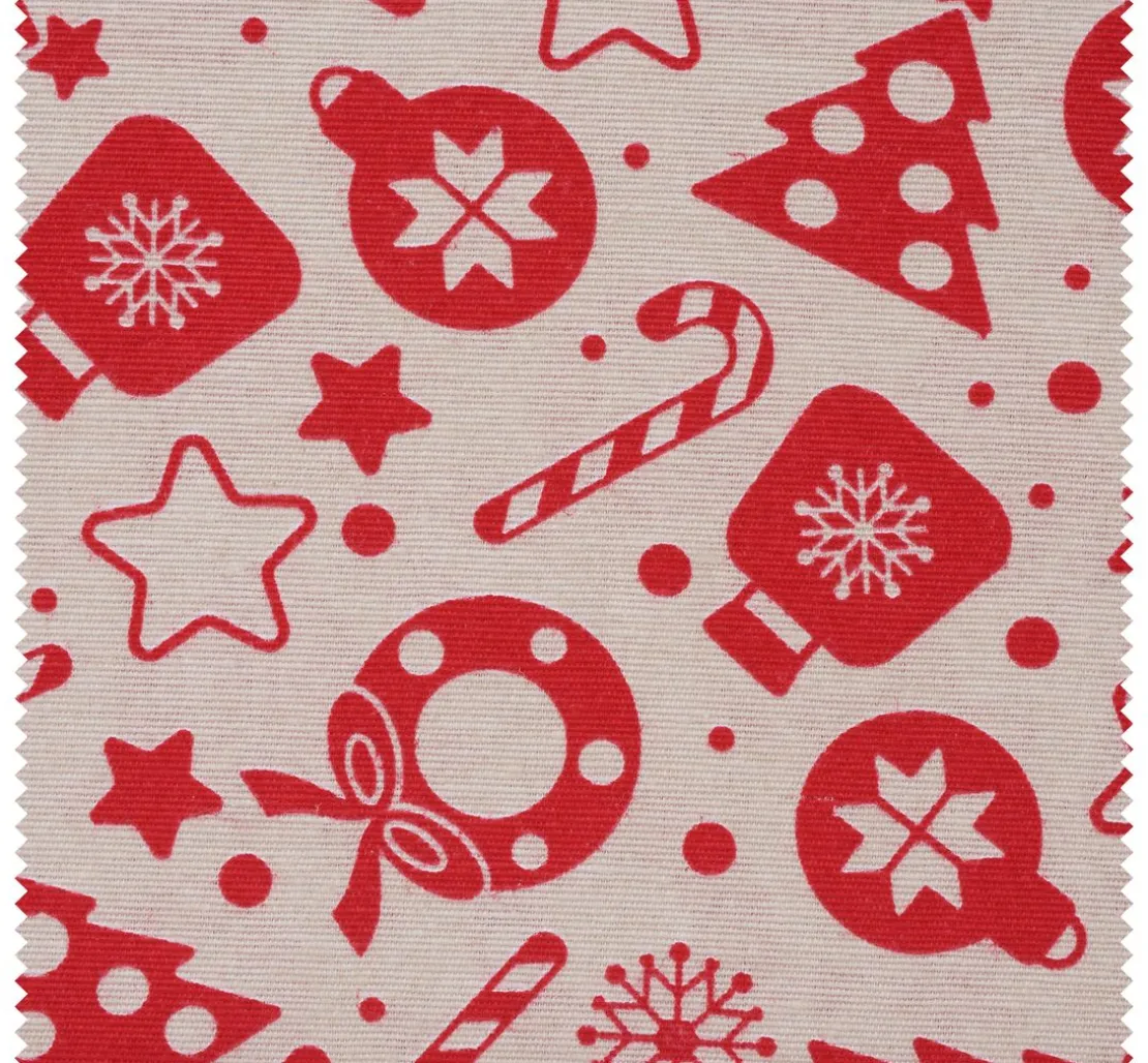 Motiv-Stoff Leinenoptik „Timeless“ mit einer Breite von ca. 140 cm und einem Stoffgewicht von ca. 170 g/m². Eine Meterware aus 55 % Baumwolle und 45 % Polyester, die bei 30 °C Feinwäsche gewaschen werden kann. Der Stoff hat einen leicht beigefarbenen Hintergrund mit einem roten Druck aus Kränzen, Tannen, Sternen und mehr.