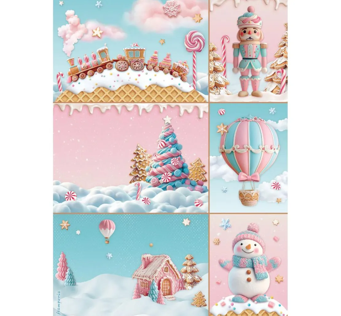 Entdecke die zauberhafte Welt der Motiv-Strohseide „Candy Christmas – Cards“ und lass deiner Kreativität freien Lauf! Mit sechs einzigartigen Motiven wie Nussknacker, Zug und Schneemann in soften Candy-Farben kannst du deine Bastelprojekte zum Leben erwecken.