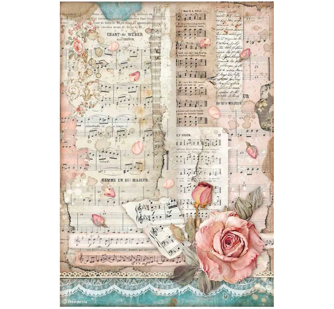Eine zauberhafte Motiv-Strohseide „Rosen und Musik“ in einem DIN A4 Format. Ein hochwertiges Naturpapier, hergestellt aus Pflanzenfasern, mit einem Gewicht von 28 g/m². Das Papier ist äußerst reiß- und wasserfest und eignet sich ausgezeichnet für die Gestaltung mit der Decoupage-Technik.