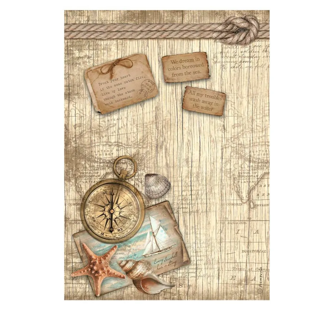 Tauche ein in die maritime Welt der Meere, der Seefahrt und der Abenteuer. Mit der Motiv-Strohseide „Sea Land – Compass“ aus der Kollektion Sea Land von Stamperia wird die Dekoration ganz einfach. Das maritim gestaltete Papier zeigt einen Kompass, Muscheln und eine Postkarte mit einem Segelschiff und entführt dich in eine maritime Atmosphäre. Das DIN A4 Format und das Gewicht von 28,0 g/m² machen das Papier zu einem idealen Begleiter für deine Bastelprojekte.