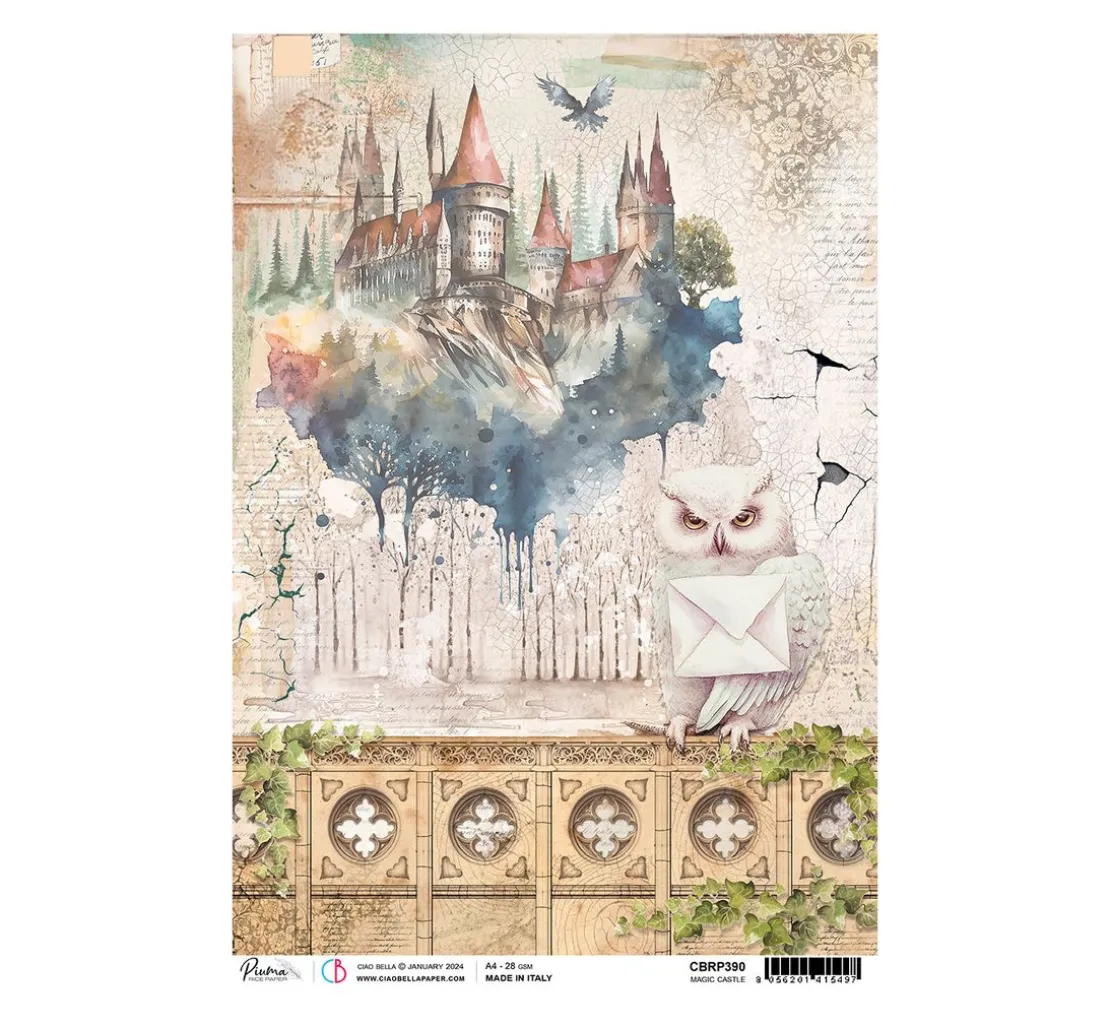 Die Motiv-Strohseide „Magic Castle“ aus der Kollektion Wizard Academy von Ciao Bella ist ein absolutes Must-Have für alle Bastelfans. Das Motiv zeigt eine geheimnisvolle Burg, die von einer Eule mit einem Brief in den Klauen überbracht wird. Der Hintergrund ist mit Rissen und Ornamenten verziert, was dem Motiv einen mystischen Touch verleiht.