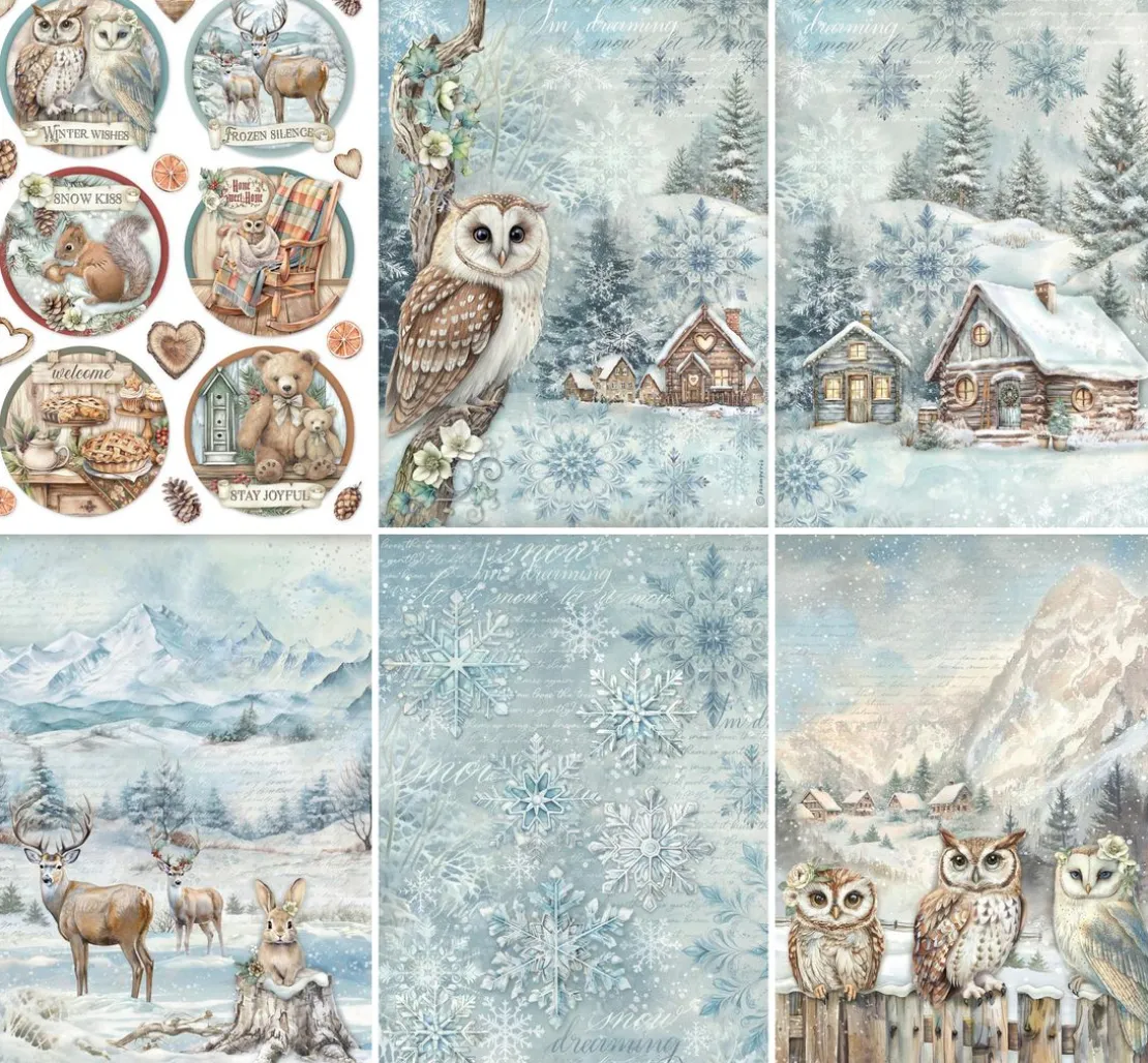 Entdecke die zauberhafte Welt der Kreativität mit dem Motiv-Strohseiden Sortiment „The Owl’s House“. Dieses einzigartige Set, bestehend aus sechs liebevoll gestalteten Motiven im DIN A4 Format, lädt dich ein, deine Bastelprojekte auf ein neues Level zu heben. Die einseitig mit Eulen, Blockhütten, Hirschen, Schneeflocken und vielem mehr bedruckten Blätter sind aus Naturpapier gefertigt, das besonders reiß- und wasserfest ist und sich ideal für die Servietten- und Decoupage-Technik eignet.