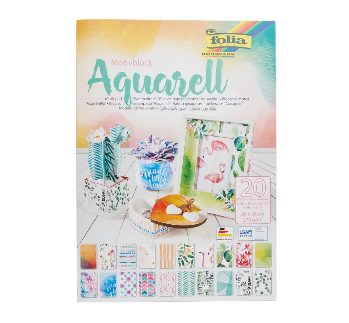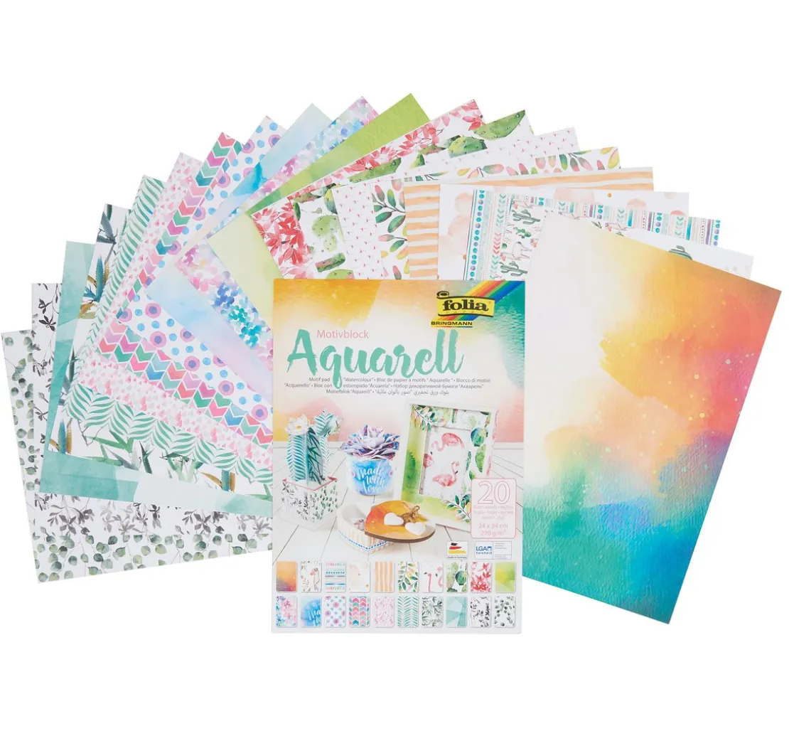 Mit diesem Motivblock „Aquarell“ erhalten Sie 20 Blatt einseitig bedrucktes Motivpapier. Das Papiergewicht beträgt 270 g/m² und die Größe ist 24 x 34 cm. Es handelt sich hier um ein Papier Made in Germany das LGA getestet ist.