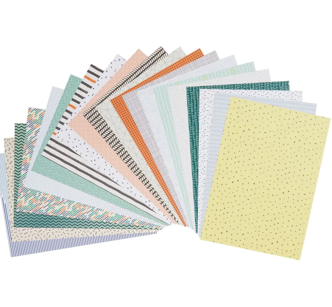 Das Motivpapier ist mit minimalistischen Motiven bedruckt. Dreiecke, Linien, Kreuze und Karos lassen sich gut miteinander kombinieren. Auch die Farben sind harmonisch aufeinander abgestimmt und eignen sich hervorragend für Scrapbook-Projekte, Geschenkschachteln oder für die neuesten kreativen Ideen bei der Kartengestaltung. So macht das Basteln Spaß und Sie bekommen im Handumdrehen zauberhafte Ergebnisse.