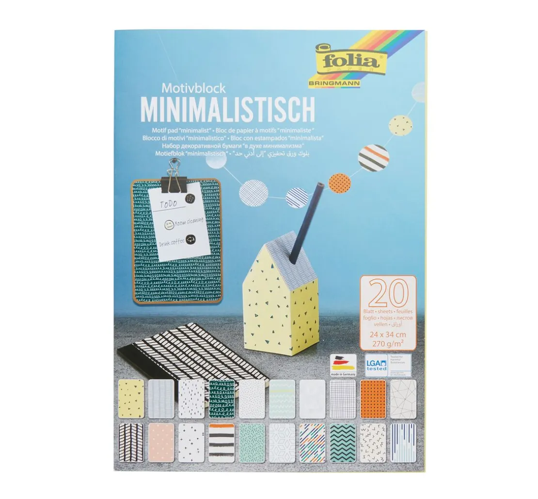 Ein schöner Motivblock „Minimalistisch“ mit einem Papiergewicht von ca. 270 g/m² und einer Größe von 24 x 34 cm. Sie erhalten 20 Blatt einseitig bedrucktes Motivpapier. Es handelt sich hier um ein Produkt Made in Germany das LGA getestet ist.