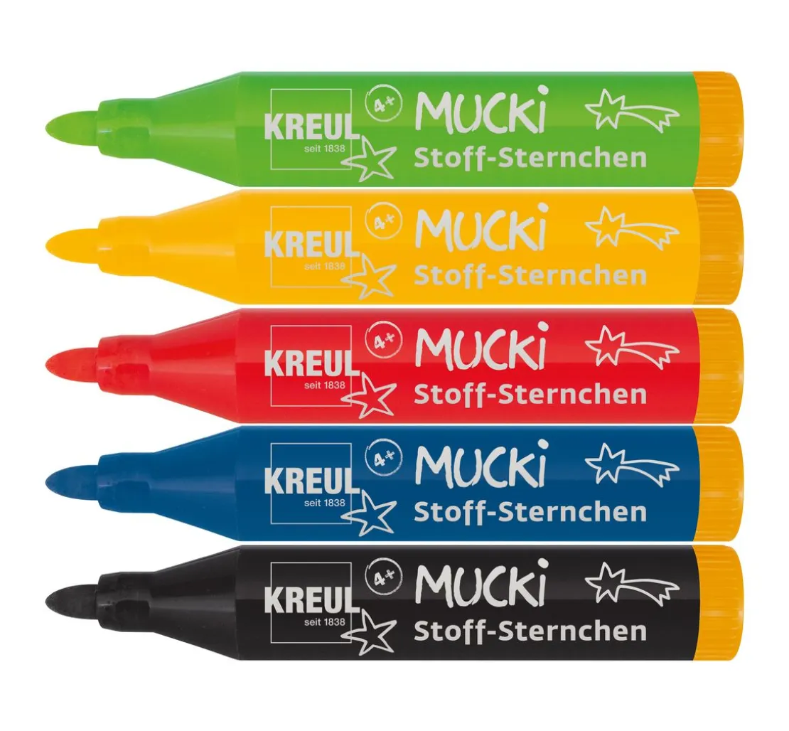 Mucki Stoff-Sternchen Stoffmalstift im 5er-Set in den Farben Gelb, Rot, Blau, Grün und Schwarz, mit einer Strichstärke von ca. 2-5 mm.