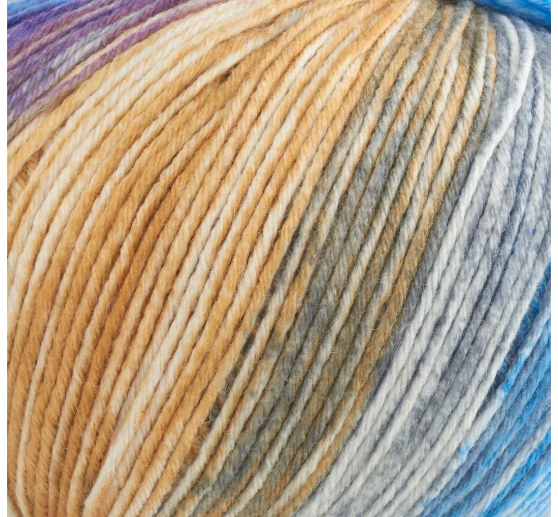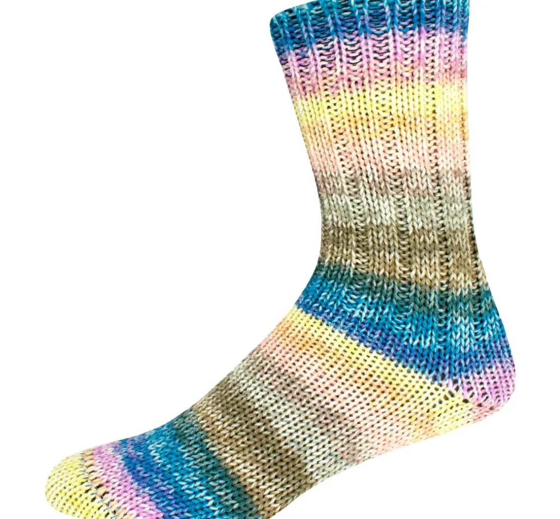 Warme ONline Wolle Supersocke Merino-Color, Sortierung 349 mit einem Verlauf aus einer tollen Farbkombination. Das ca. 150 g schwere Knäuel hat eine Lauflänge von ca. 375 m und lässt sich idealerweise mit einer Nadelstärke von 3 – 4 verstricken. Die hochwertige, 6-fädige Wolle mit 75 % Schurwolle (Merinowolle superwash) und 25 % Polyamid ist bestens für das Stricken von Socken geeignet.