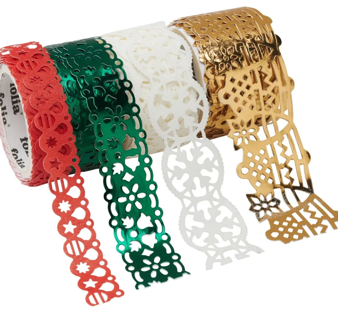Wundervolle Papierbordüren „Xmas“ die zum Kreativ werden einladen. Die 4 Bordüren aus Papier sind selbstklebend und haben verschiedene Designs wie Kugeln, Schneeflocken, Glocken und weihnachtliche Motive. Die Breite beträgt ca. 0,8 cm. 1,5 cm, 1,7 cm und 2,3 cm mit einer Länge von jeweils ca. 1 m.