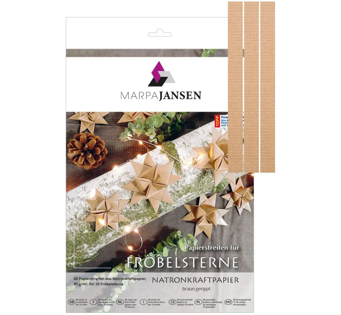 Fröbelsterne sind zur Advents- und Weihnachtszeit gar nicht mehr weg zu denken. Aus diesen 80 Papierstreifen lassen sich 20 Fröbelsterne fertigen. Sie sind eine klasse Dekoration fürs Fenster, in Kränzen, als Tannenbaumschmuck, auf dem Tisch, Regal, Kommode oder Fensterbank. Aber auch zum Verzieren von Schachteln und Papiertüten oder als Geschenkanhänger eignen sich die Sterne hervorragend. Das Anfertigen ist mit der enthaltenen ausführlichen und bebilderten Anleitung ganz einfach.