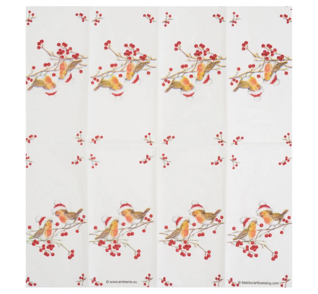 Die Einseitige Bedruckung auf weißem Hintergrund macht die Papiertaschentücher „X-Mas Robin“ zu einem besonderen Hingucker. Mit der Serviettentechnik kannst du das Motiv einfach auf verschiedene Untergründe wie Holz, Pappe, Karton oder Stoff übertragen – für individuelle und kreative Gestaltungen! Wie wäre es zum Beispiel mit einer selbstgemachten Weihnachtskarte oder einer dekorativen Holzbox?