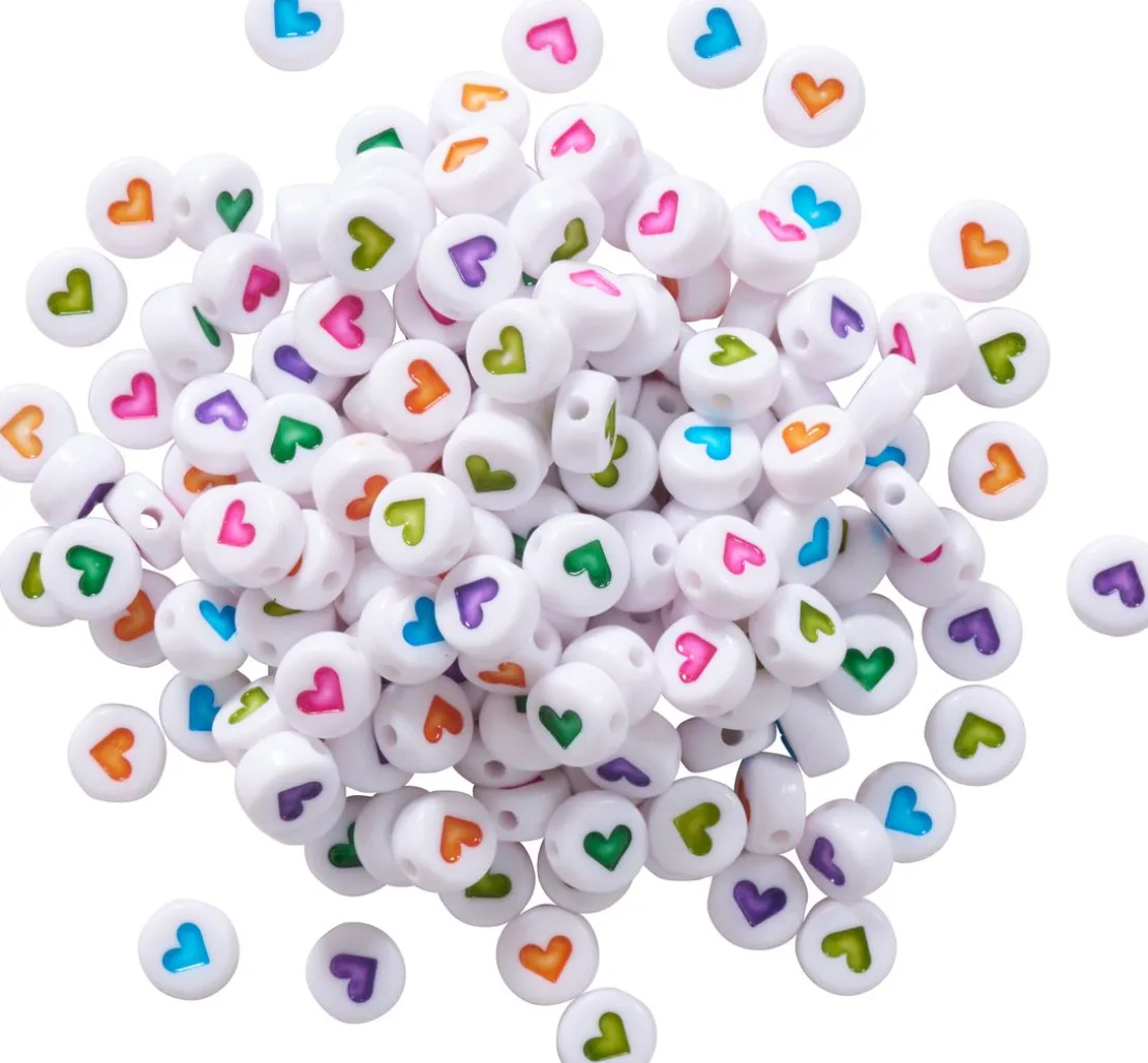 Dieses Perlen-Set, rund enthält 165 weiße Perlen, welche mit Herzen in unterschiedlichen Farben verziert sind. Die Perlen haben einen Ø von ca. 7 mm und einen Stärke von ca. 4 mm. Der Ø der Bohrung ist ca. 1 mm.