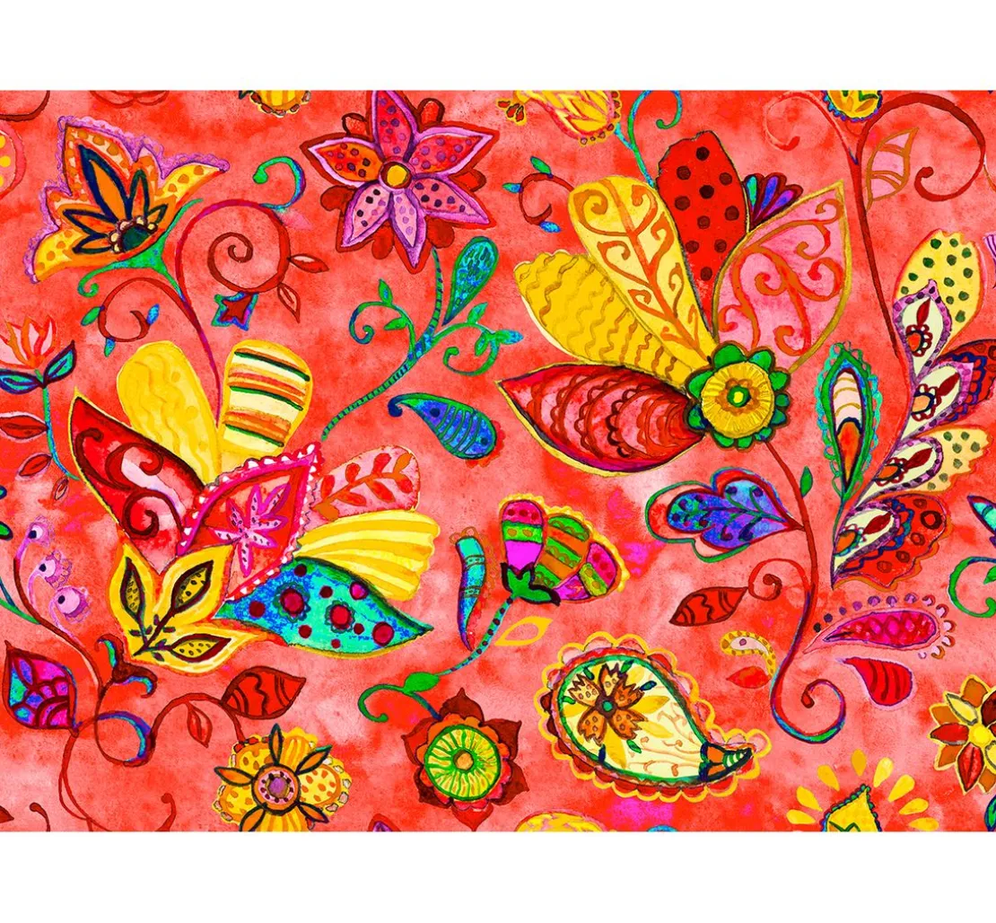 Der Motivstoff besticht durch seine lebendigen Farben: Große Blüten in Rot, Gelb, Grün und Türkis erblühen auf einem satten hellroten Hintergrund und bringen sommerliche Frische in deine Kreationen. Dank modernster Transferdrucktechniken bleiben diese Farben auch nach mehreren Wäschen bei 30 °C leuchtend und strahlend.